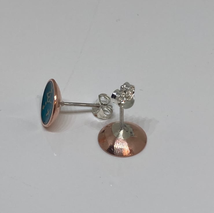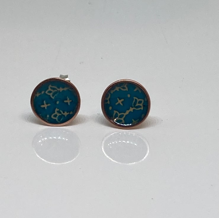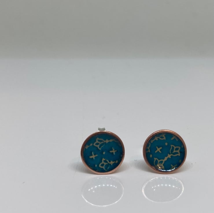 Enamelled copper stud earrings featuring a teal fabric inspired pattern. The earring is concave with a natural copper finish on the back and has sterling silver posts and scrolls