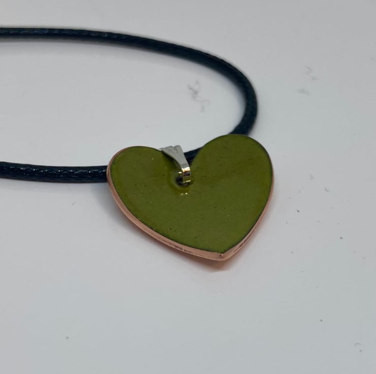 Enamelled copper pendant in olive green. It is suspended from a 45cm (18 inch) black waxed cotton cord
