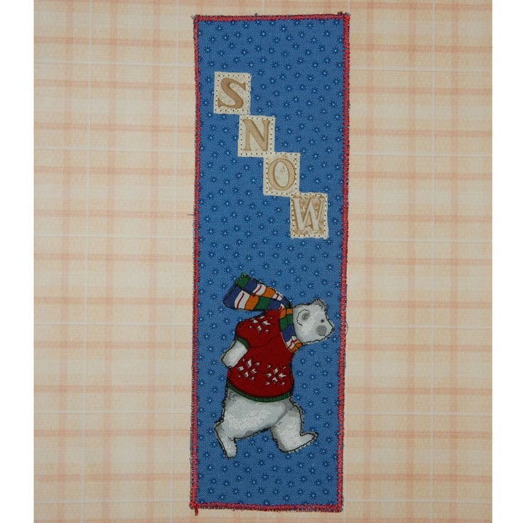 This bookmark features a polar bear in a scarf and jumper walking in the snow. The polar bear has been appliqued onto the background cotton fabric and the word "snow" has been added. It measures 2.5 x 8 inches, is made from cotton fabrics. The edge is stitched in red thread. There is a layer of stiffening and a plain navy fabric on the reverse. It would make an ideal small gift, or stocking filler, it is light to post if necessary and could be slipped in with a card.