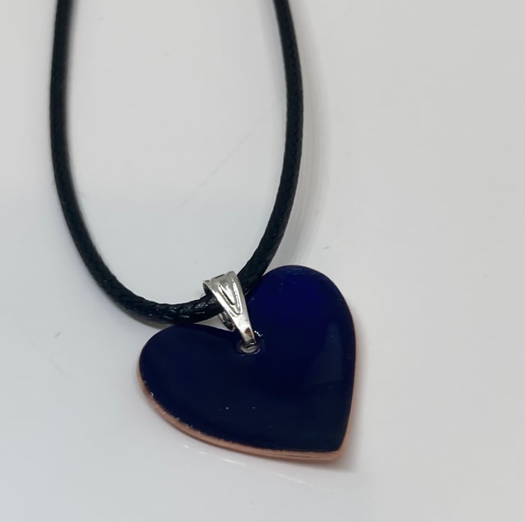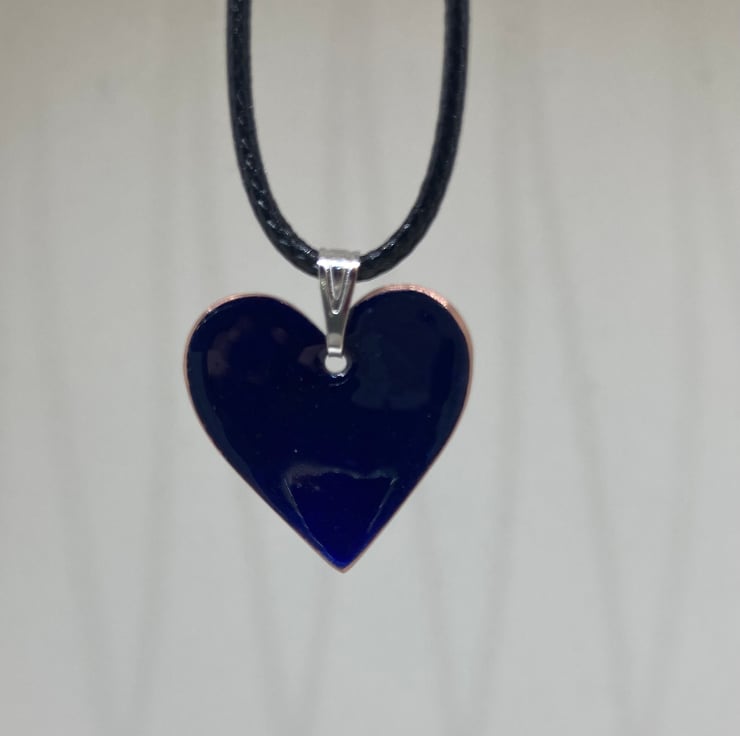 Enamelled copper pendant in dark blue. It is suspended from a 45cm (18 inch) black waxed cotton cord
