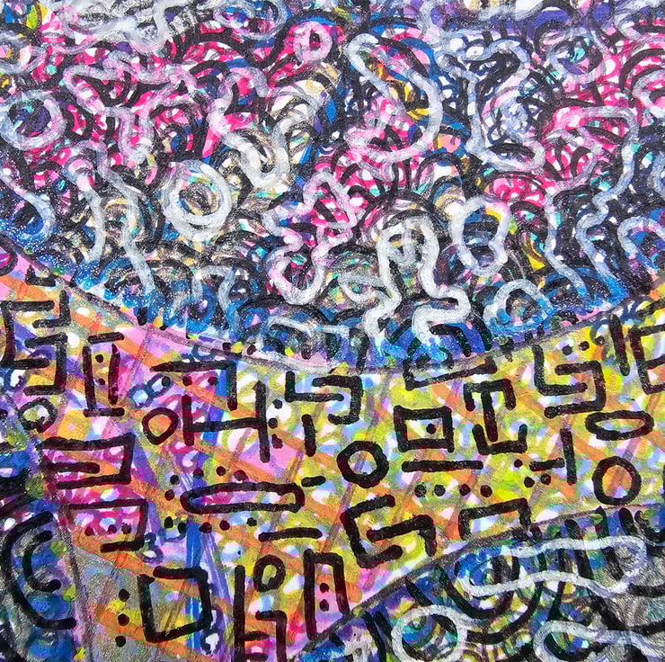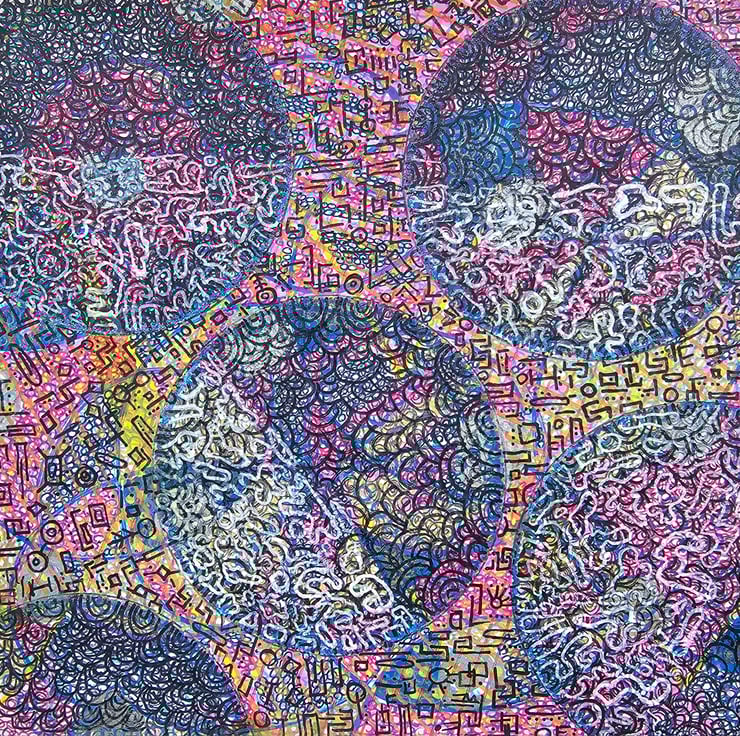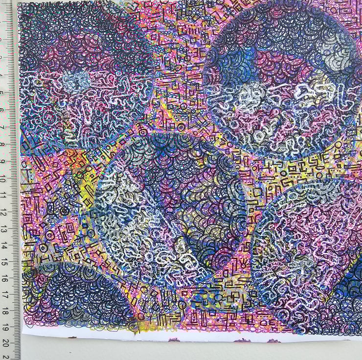 Layers of pen patterns and inks hand drawn in this gemotric piece. Would make a fun office or kitchen additon for a small space.