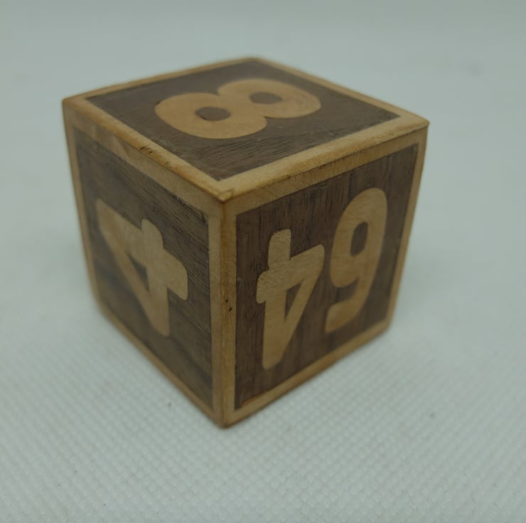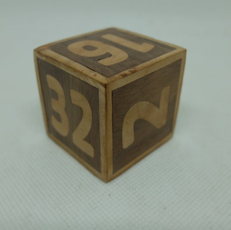 For use when playing Backgammon - a large wooden doubling cube, veneered in a fruit wood veneer with walnut background
