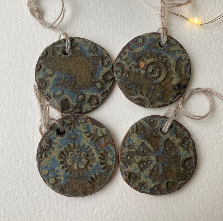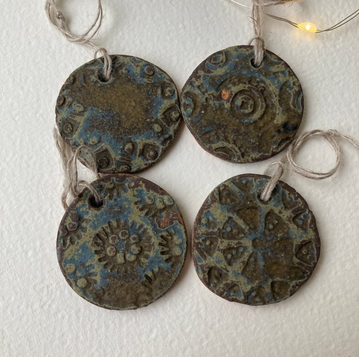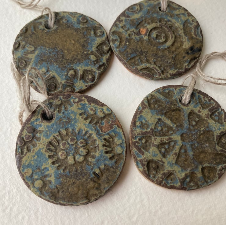 Textured stoneware decorations finished with a dry blue glaze. They remind me of ancient objects with this glaze application.