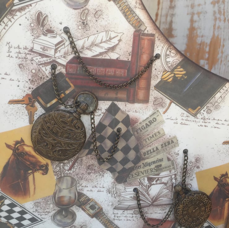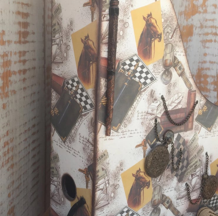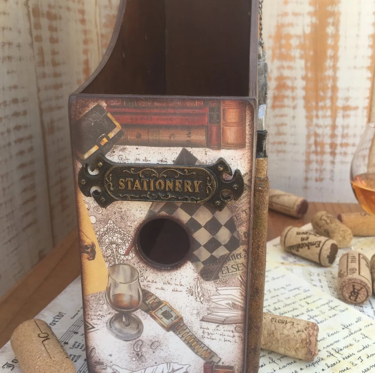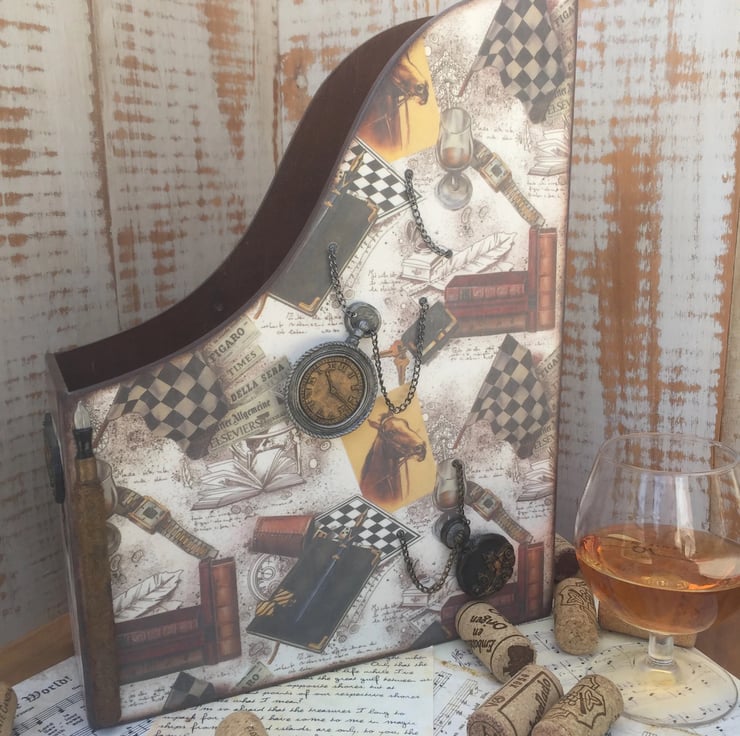 Elevate your workspace with this stylish wooden document stand, crafted from durable birch plywood and adorned with a vintage-inspired design. Decorated using the intricate decoupage technique and enhanced with distressed acrylic accents and decorative chains, this stand exudes character and sophistication.