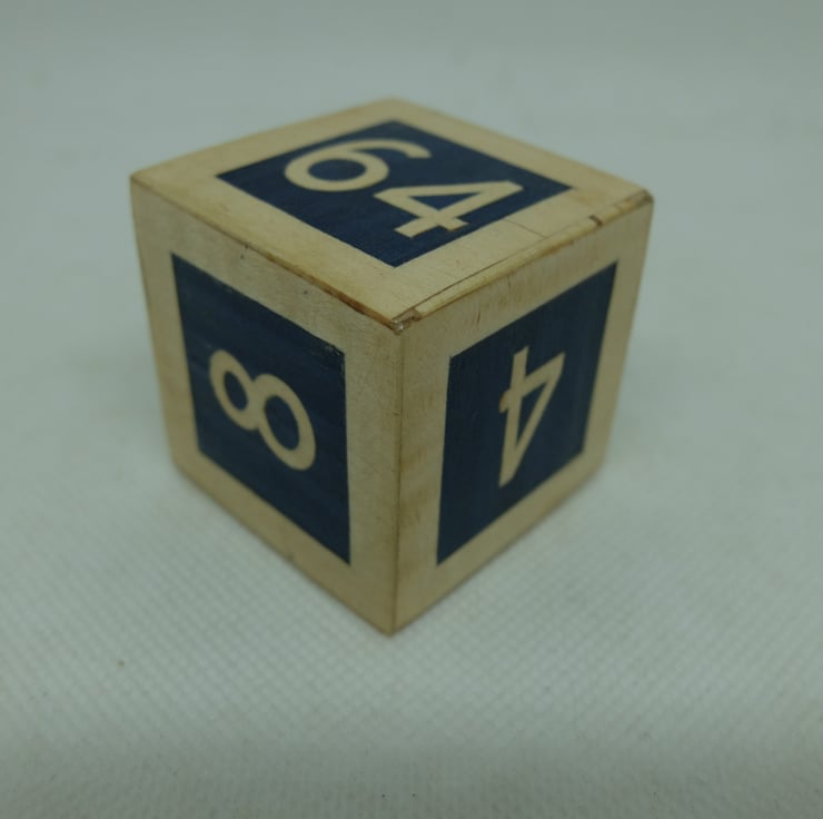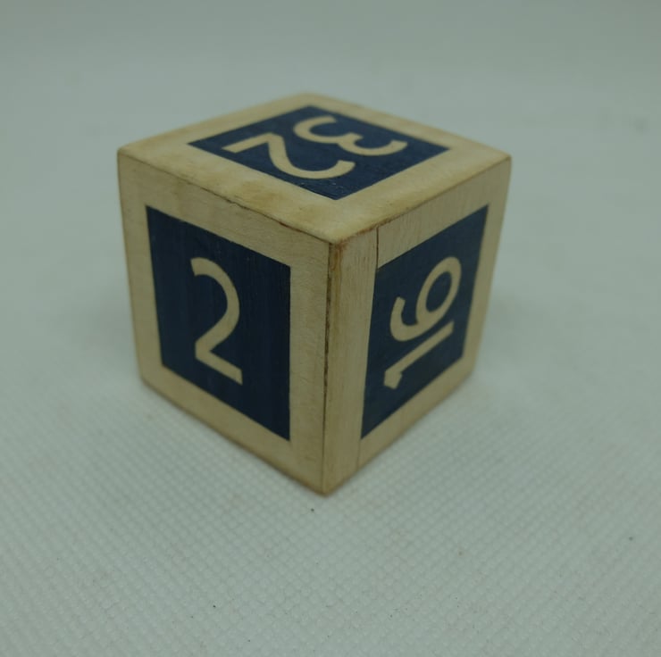 For use when playing Backgammon - a large wooden doubling cube, veneered in light wood with a dyed blue wood background.