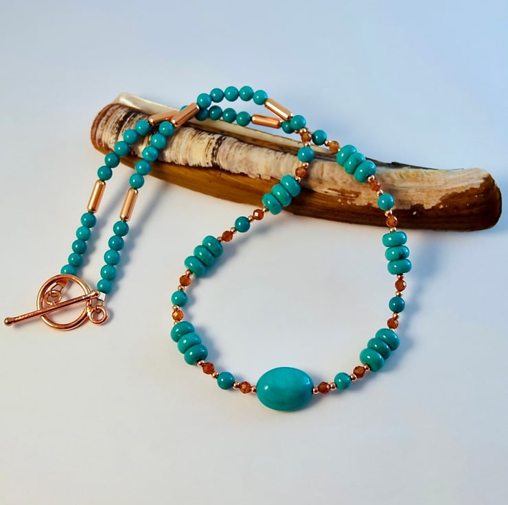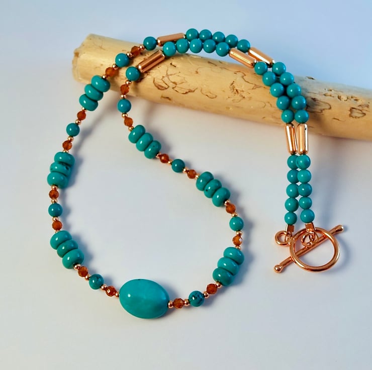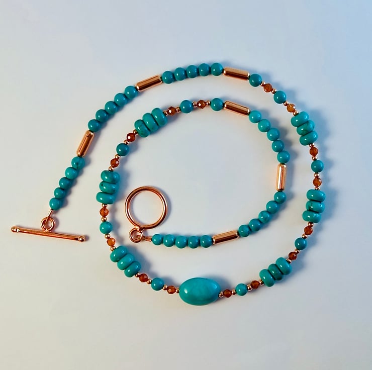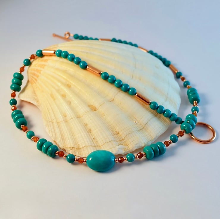 The necklace continues with rows of five 4mm Turquoise and 3x10mm copper tubes, and fastens with a simple copper toggle clasp.