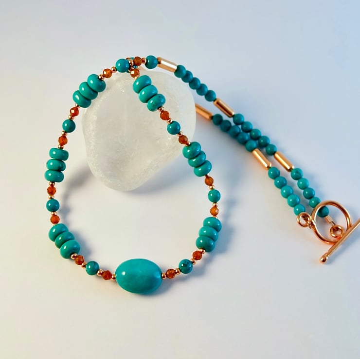 Each trio of rondelles is separated by a 4mm Turquoise bead with a pair of 3mm faceted AAA Hessonite Garnet, highlighted with tiny 2mm copper beads.