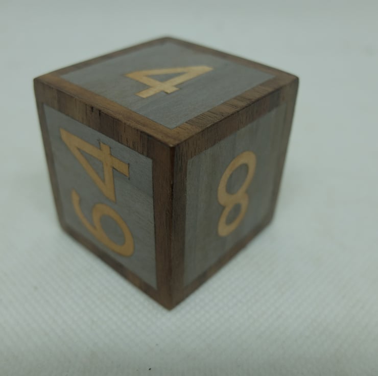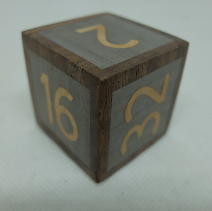 For use when playing Backgammon - a large wooden doubling cube, veneered with walnut borders, light grey background and light wood numbers