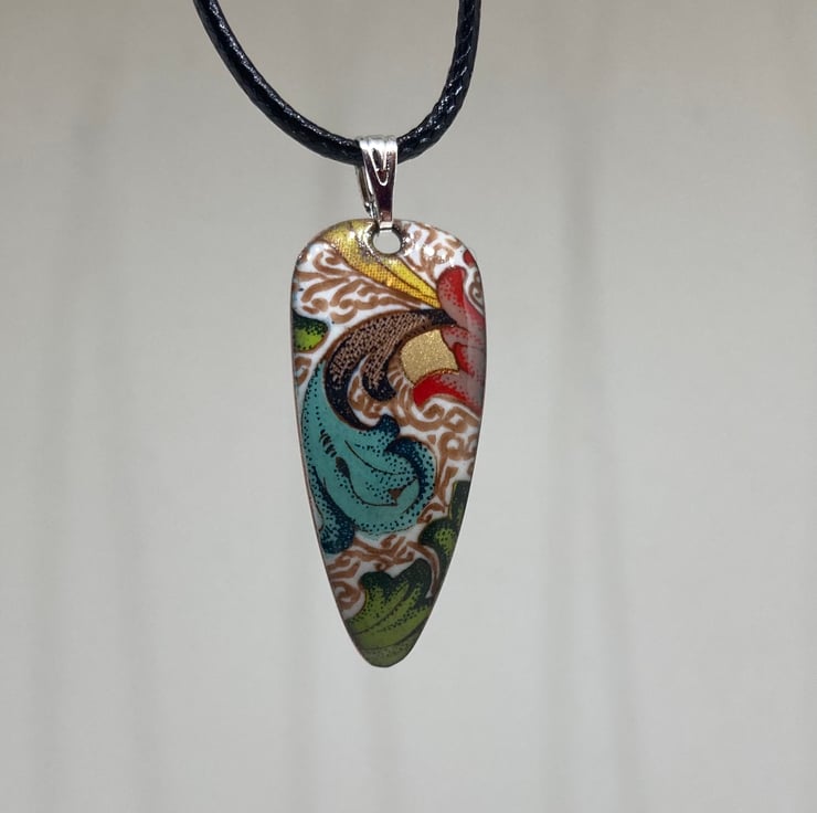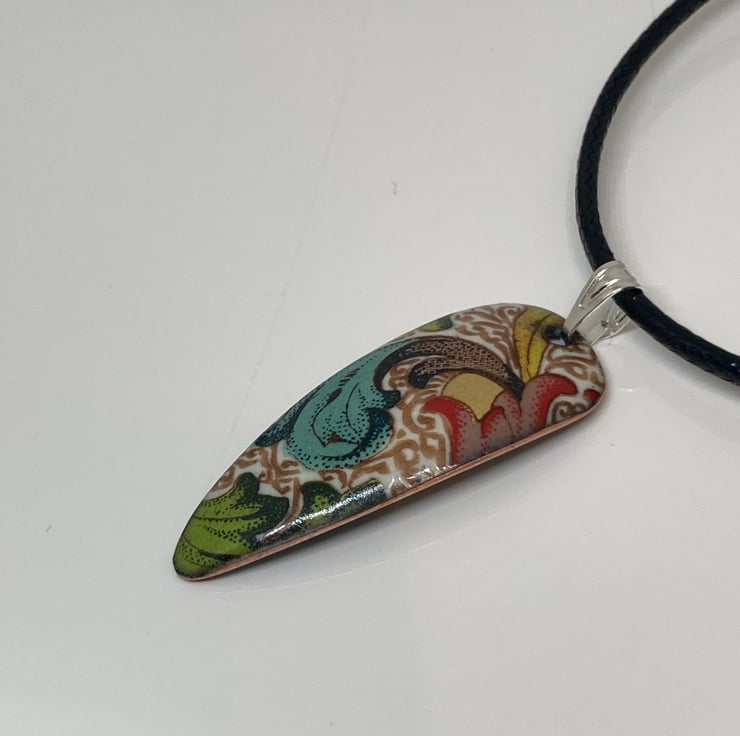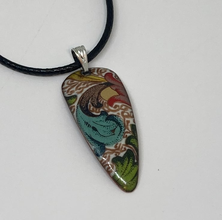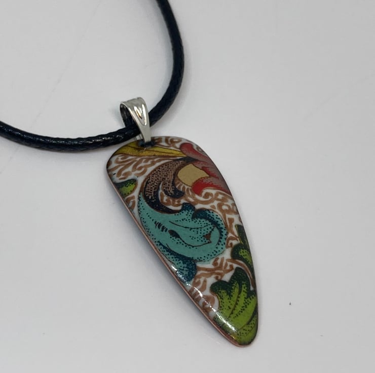 Enamelled copper pendant, decorated with an elaborate colourful pattern. This pendant is counter-enamelled on the back and is supplied with a 45 cm black waxed cotton cord.