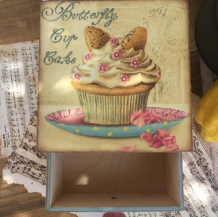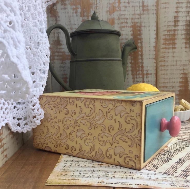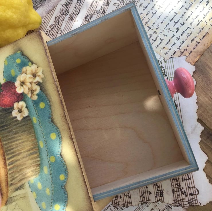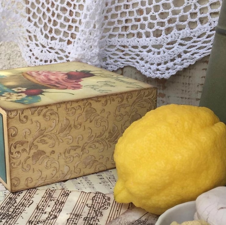 Add charm and functionality to your kitchen with this handcrafted wooden storage box, perfect for holding tea, sweets, sugar cubes, cookies, macaroons, cupcakes, and more. Featuring a natural, untouched interior, this versatile box is decorated using the decoupage technique, with textured volume ornaments and a subtly distressed finish for a vintage aesthetic.