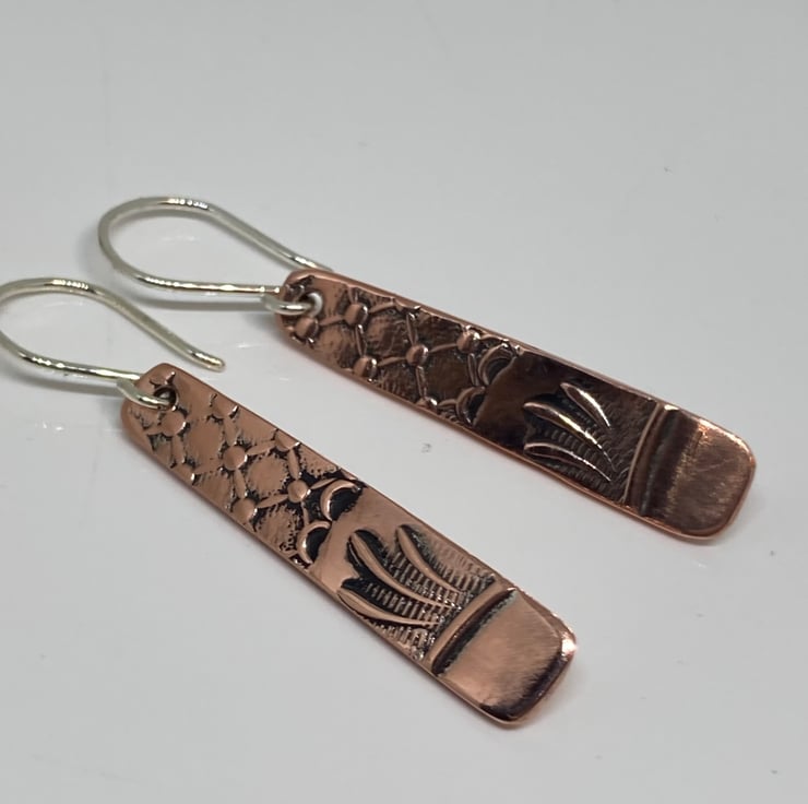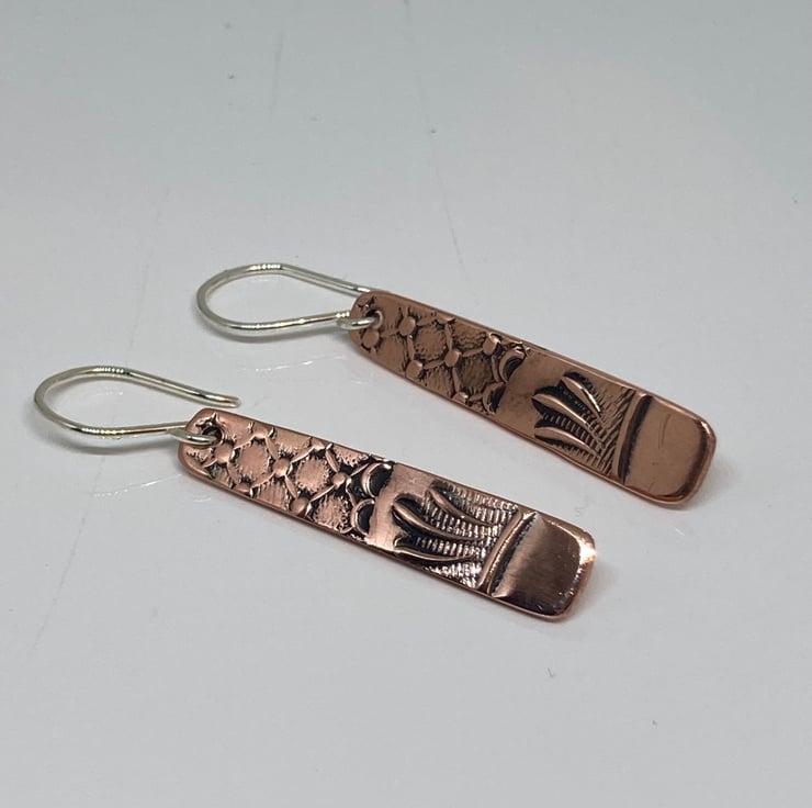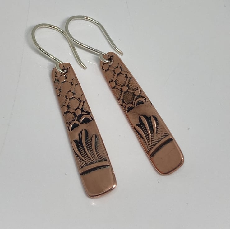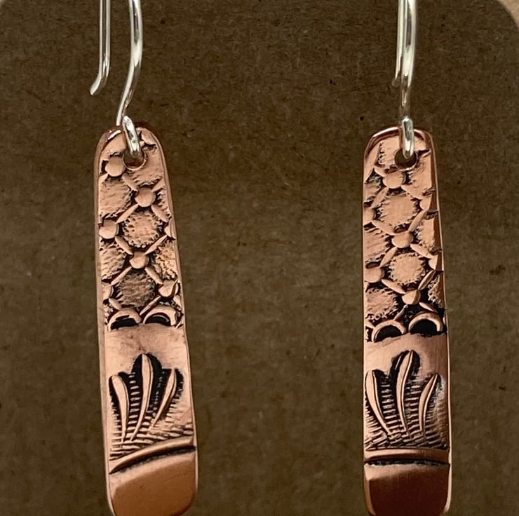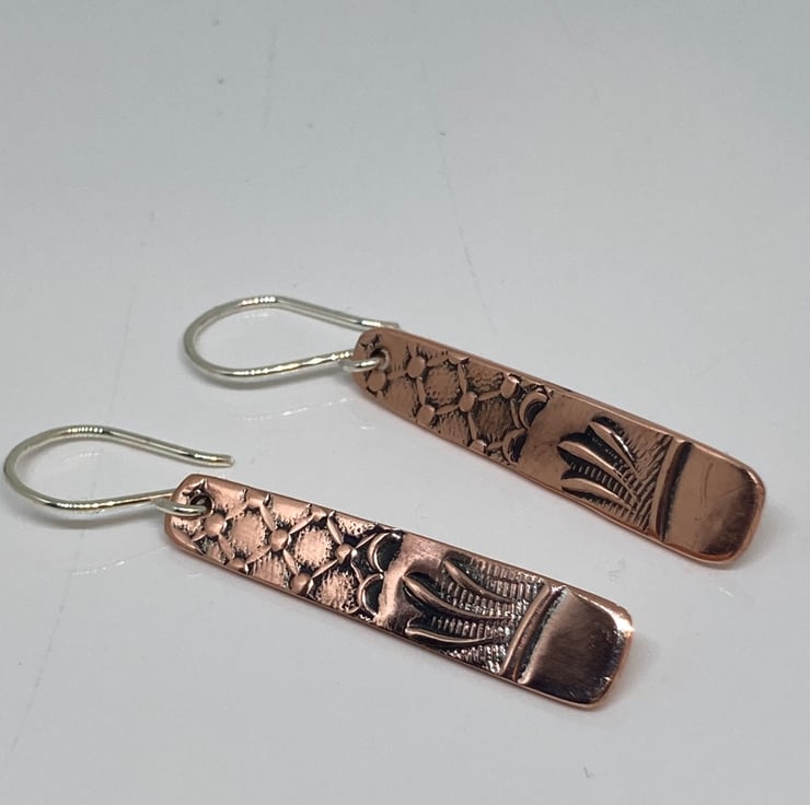 These earrings have been cut from an old silver plated copper tray and retain fragments of the original pattern. Much of the silver plate has worn off, revealing the rich copper colour beneath. They are suspended from handmade earring wires, made from recycled silver