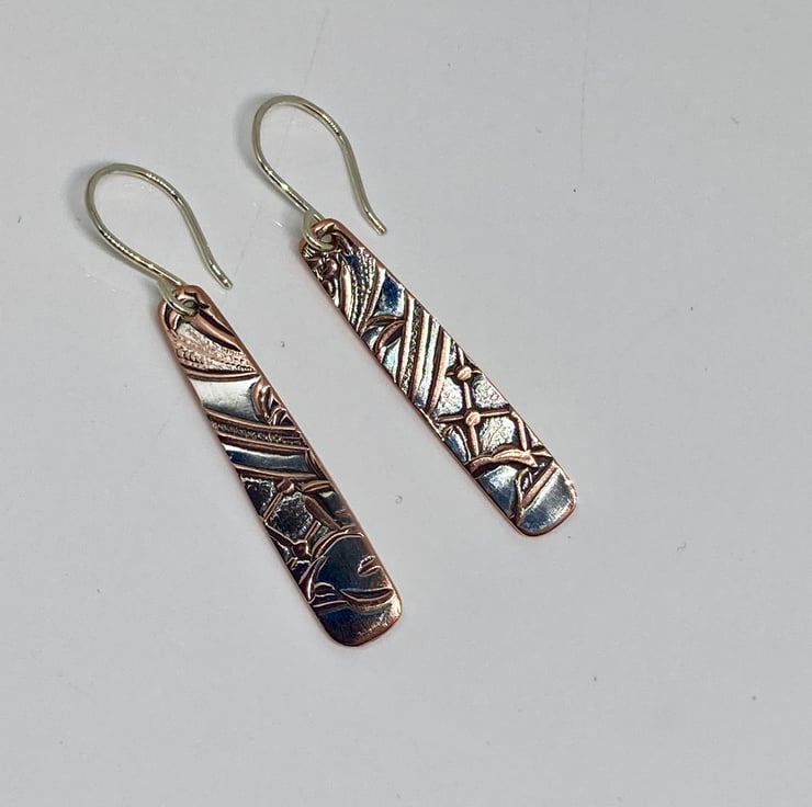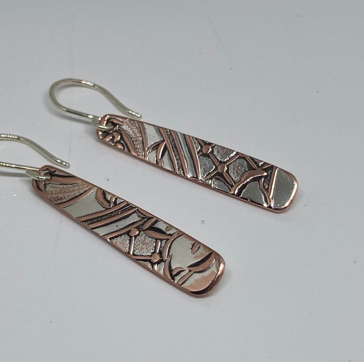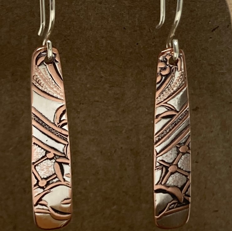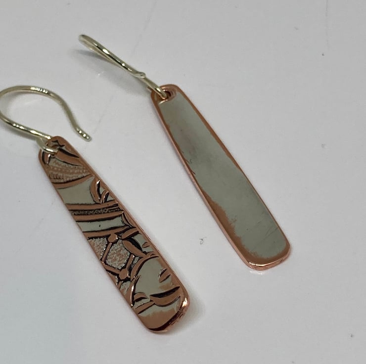 These earrings have been cut from an old silver plated copper tray and retain fragments of the original pattern. Much of the silver plate has worn off, revealing the rich copper colour beneath. They are suspended from handmade earring wires, made from recycled silver