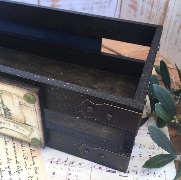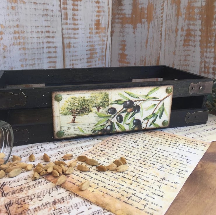 Elevate your kitchen organisation with this wooden spice caddy, perfect for storing spices, herbs, and dry goods. Featuring a sealed interior with a water-based finish for durability and an exterior stained in a rich dark olive hue, this caddy exudes rustic charm. The lightly distressed finish and decorative medallions on both sides add a touch of vintage elegance, making it a stylish yet functional addition to your home.