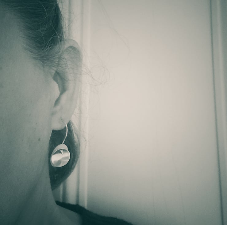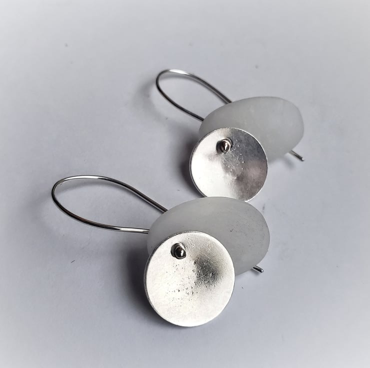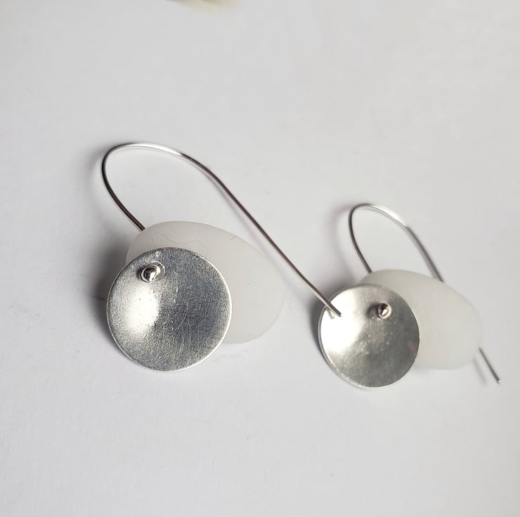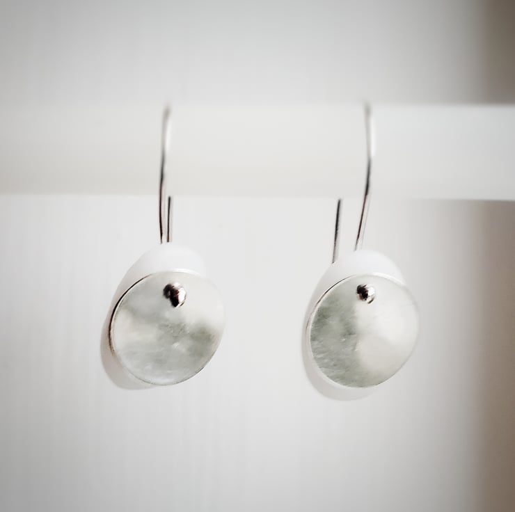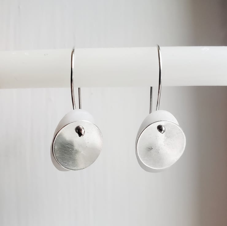 A contemporary pair of minimal drop earrings made with sterling silver and polymer clay on silver wires. A little silver disc dangles alongside a white one in a simple unfussy way that makes a quirky statement.