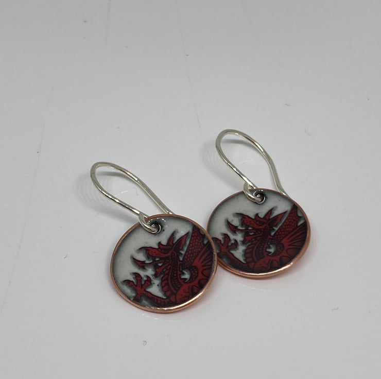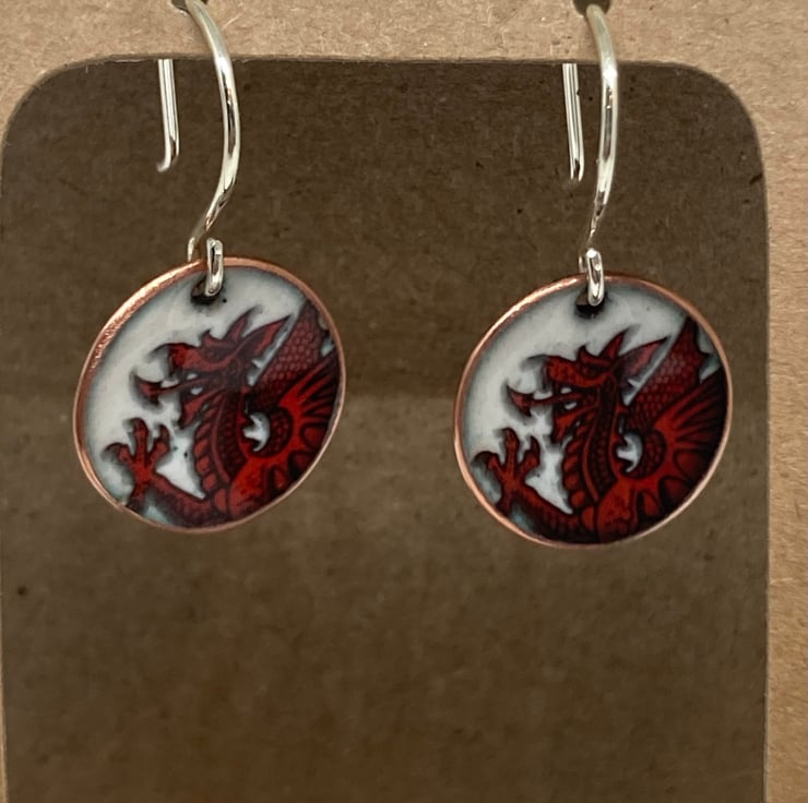 Enamelled copper earrings featuring Welsh red dragons, each earring is 1.5cm in diameter and is slightly concave, with a natural copper finish on the back. They are suspended from hand made sterling silver earring wires.