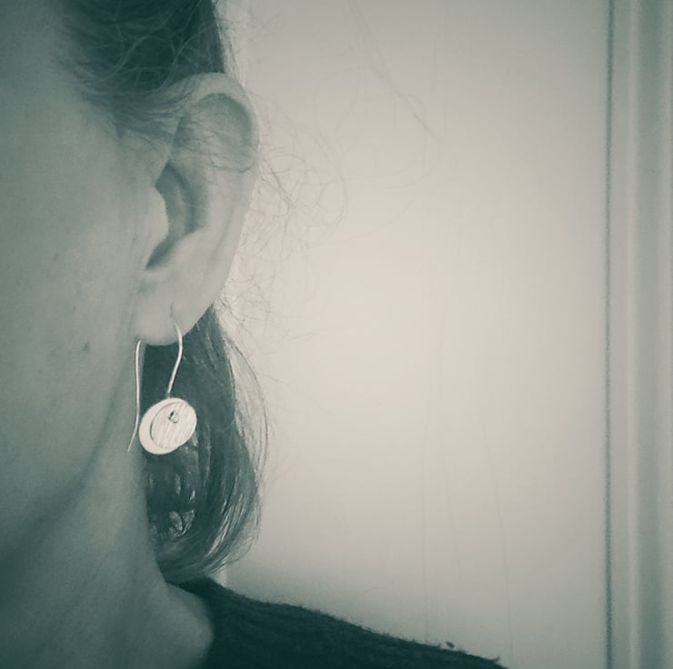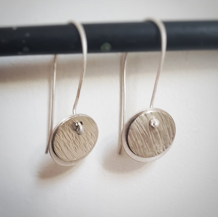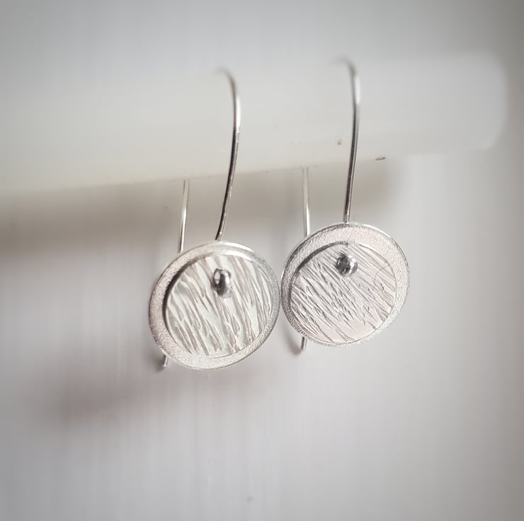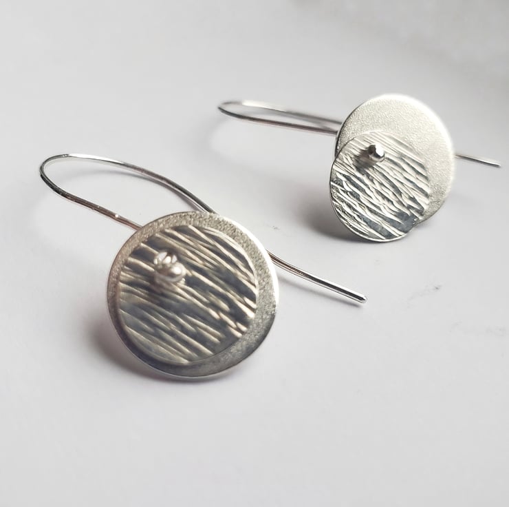 A contemporary pair of minimal drop earrings made with sterling silver on silver wires. A little silver disc dangles alongside a textured silver one in a simple unfussy way that makes a quirky statement.