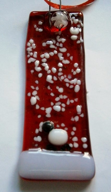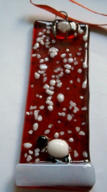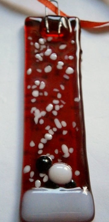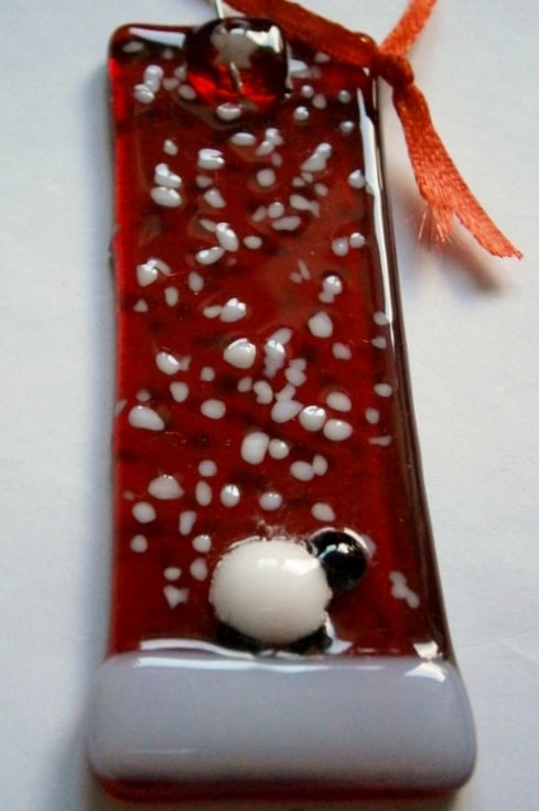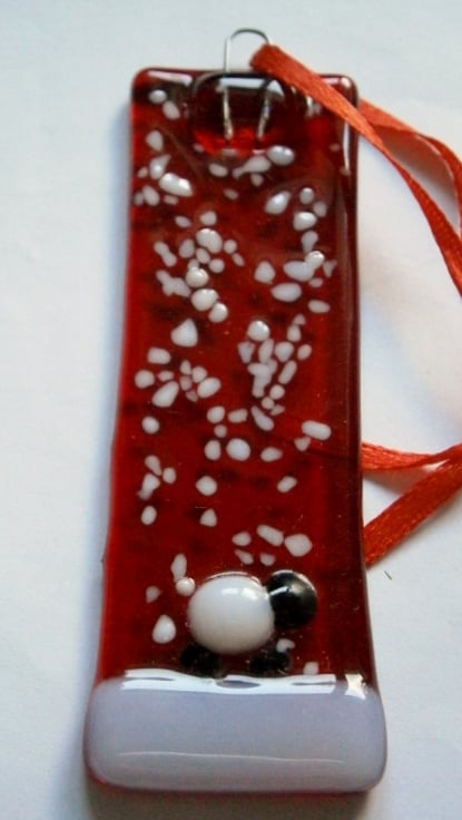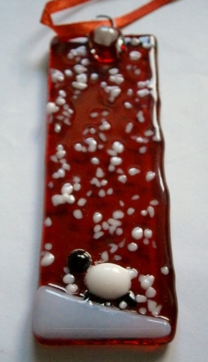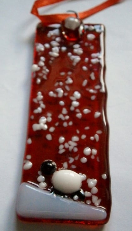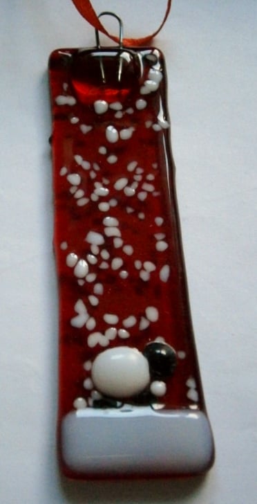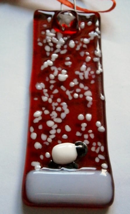 Fused glass red snowy Christmas tree decoratoins with a sheep.