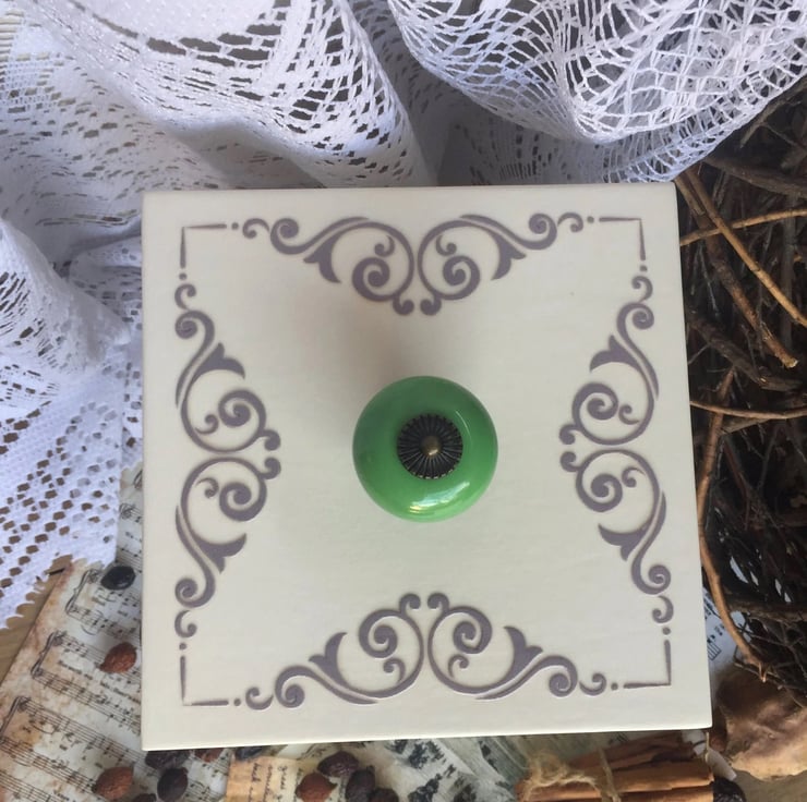 The natural, untouched interior preserves its authenticity, while the exterior is decorated using the decoupage technique and finished with a subtle distressed effect for a rustic, worn look. Resting securely on antique bronze metal feet, the box is topped with an ornate, contrasting lid featuring a ceramic knob, making it a stunning centerpiece for your tea or coffee serving routine.