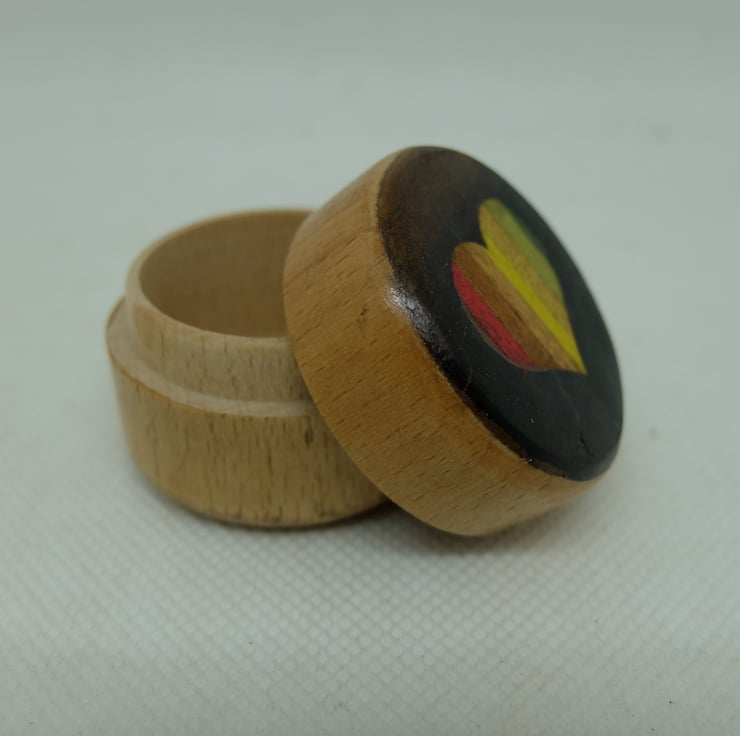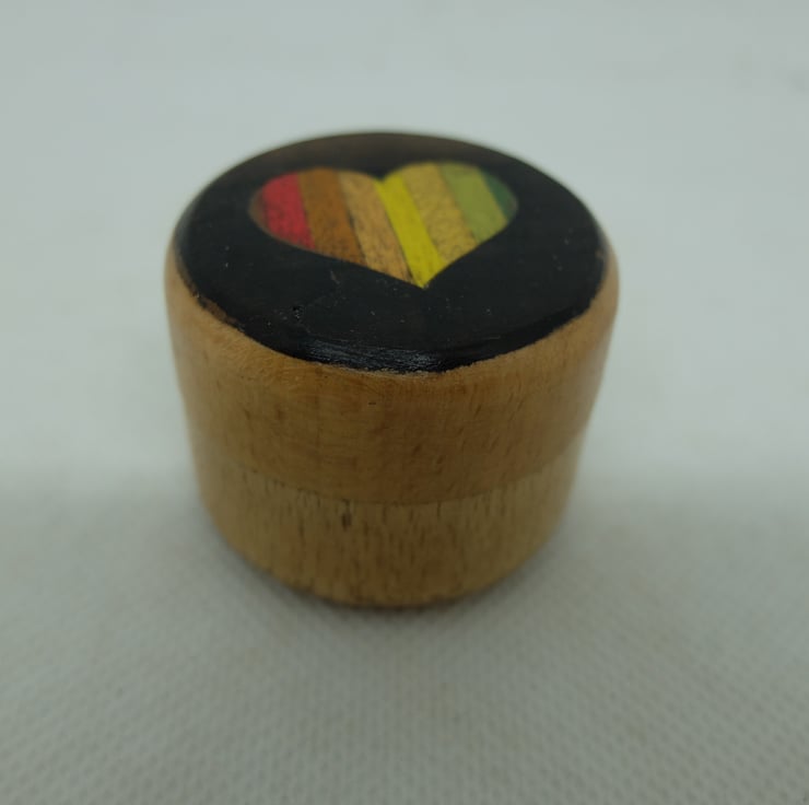 A small round pot with a lift-off lid. Veneered to lid with a rainbow heart inset into a dark background