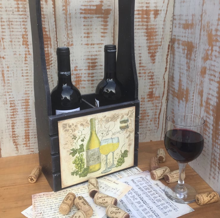 Enhance your wine display with this handcrafted wooden wine carrier, designed to hold two bottles of wine, cava, or champagne. Combining functionality with timeless elegance, this carrier features vintage-inspired decoupage designs on each side and a 3D grapevine ornament for added character. Lightly distressed for a rustic, worn look, it is sealed with water-based, non-toxic materials for lasting durability.