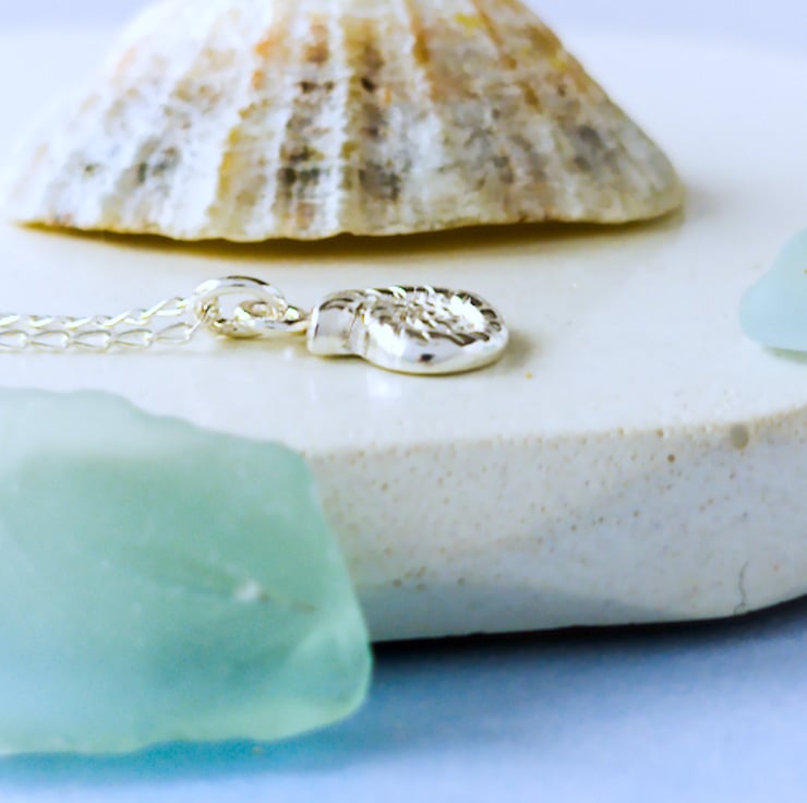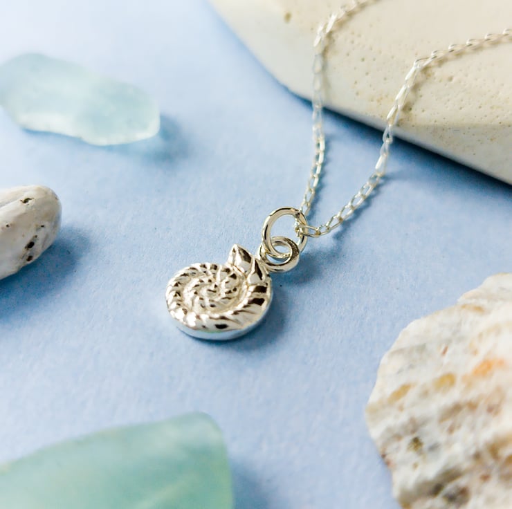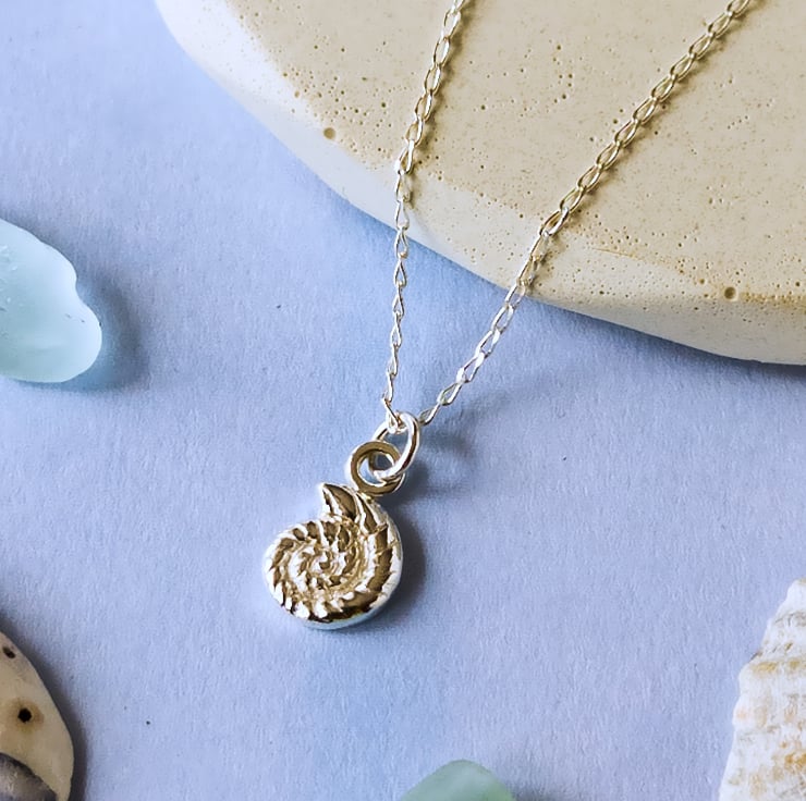 Measuring approximately 10mm x 9mm, the delicate ammonite design is perfect for those who appreciate understated, minimalist jewellery. It hangs gracefully from an 18" recycled sterling silver curb chain, adding a touch of ocean-inspired charm to any outfit.