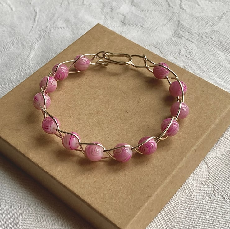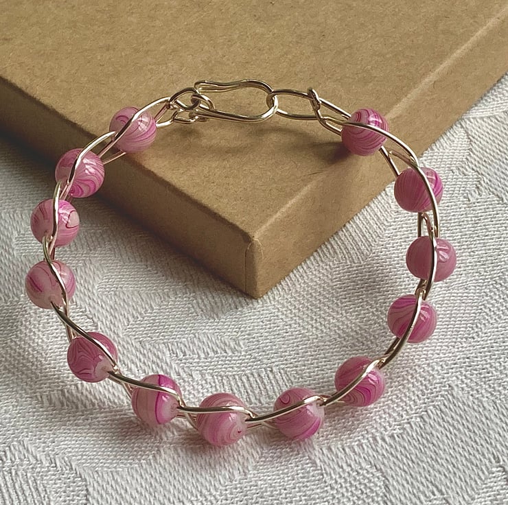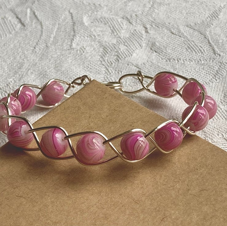 This bracelet is made with silver plated copper wire and pink striped glass beads, secured with a handmade hook and eye clasp.