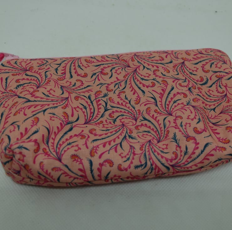 Stitched in cotton pink floral design design fabric, with cotton lining and a zip to match.