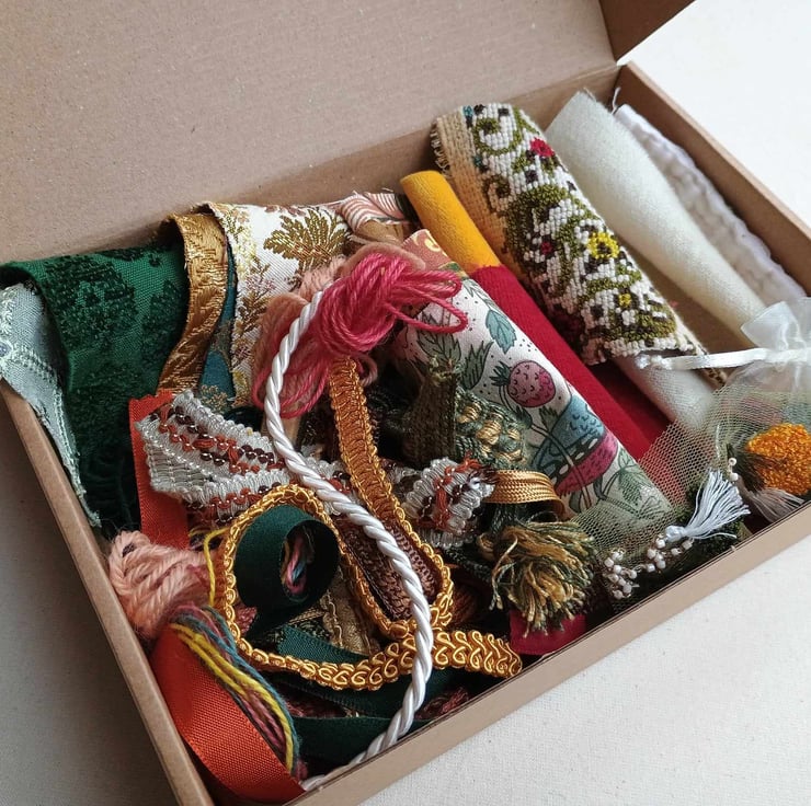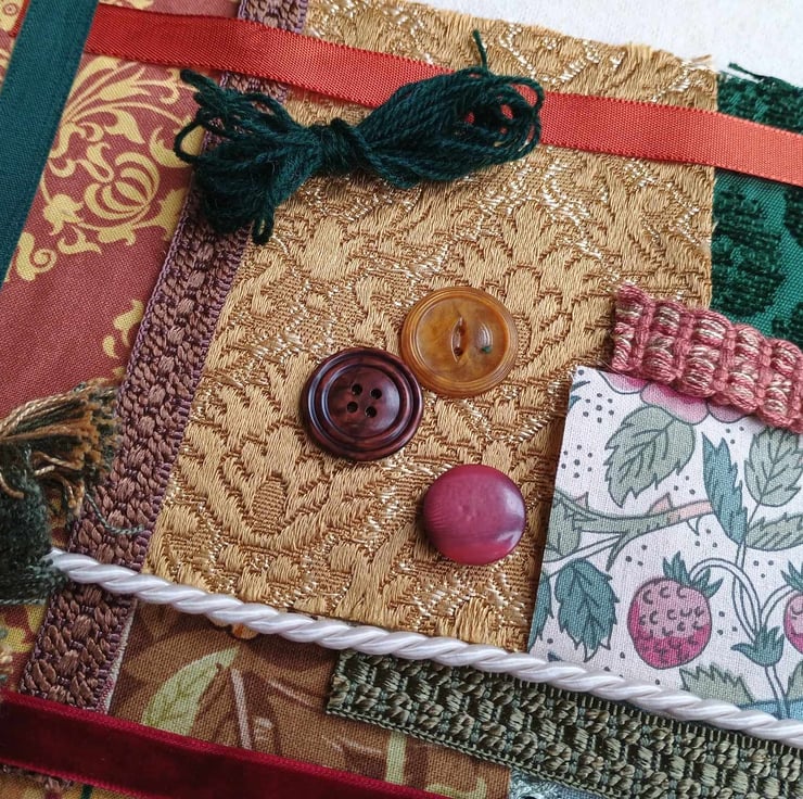 A stunning collection of material and trims in rich colours and textures inspired by a fragment of tapestry style fabric. Perfect for Christmas and winter themed projects, this kit is ideal for those new to the art of slow stitching, as well as those looking to build their collection of beautiful textile scraps. A lovely gift for a crafty friend - I can post direct and the box fits through a letterbox- or buy one for yourself and create something beautiful.