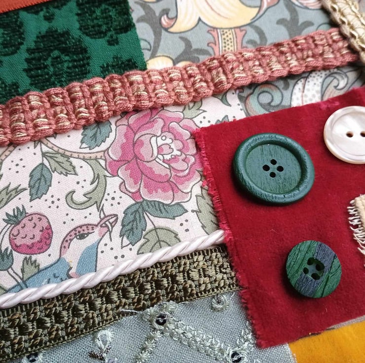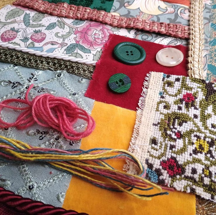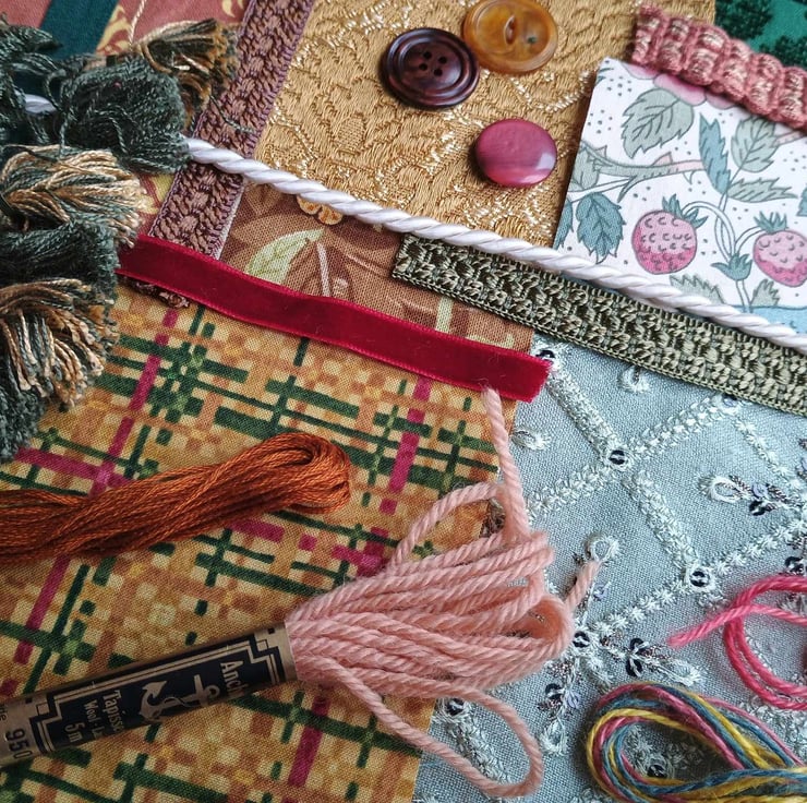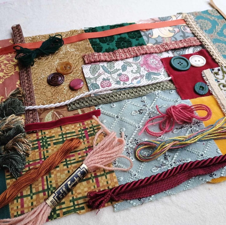 The inspiration behind this kit is the snippet of vintage tapestry style fabric - the texture and colours are so rich. I think it goes beautifully with the scraps of vintage velvet curtains and the more subdued cotton prints, as well as the brocades and trims.