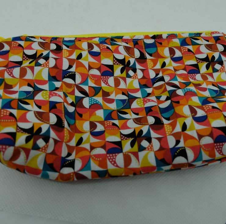 Stitched in cotton orange squares design fabric, with cotton lining and a zip to match.