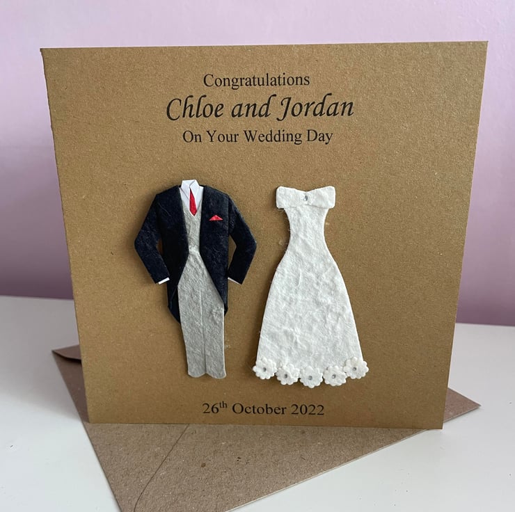 The card comes with a 3d suit with a choice of three tie colours - red, yellow or ivory, and a gorgeous slim bride dress with small flowers at the bottom of the dress..