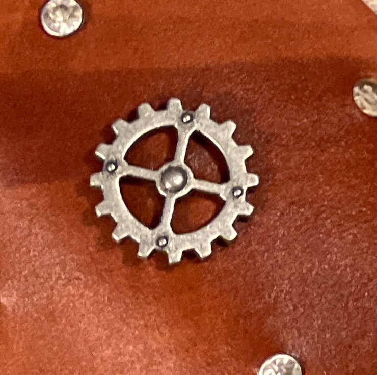 The Steampunk Gear Centre is Nickel in finish and screwed onto the leather piece - 2 White-Clear Gemstones are riveted above and below the Gear.