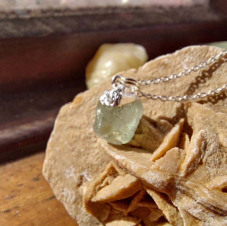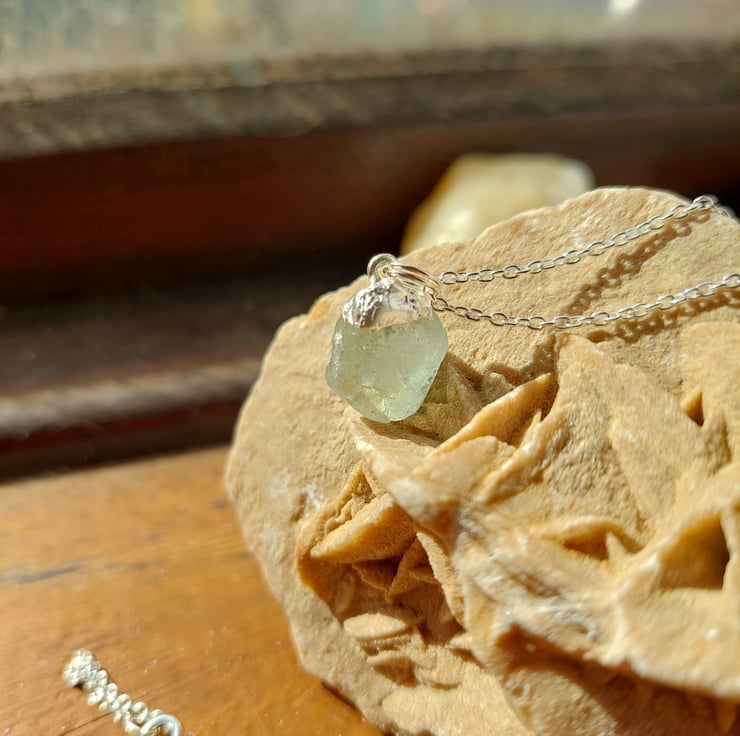 This gorgeous raw aquamarine has been capped in sterling silver and hangs from a 16-18 inch adjustable sterling silver belcher chain (there is an option to choose 18-20 on checkout). The simple beauty of the crystal is maximised in this format. Each is individual and are approximately 1.5 - 2cm in length.