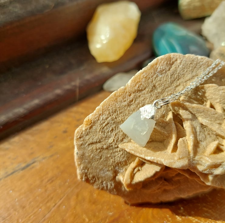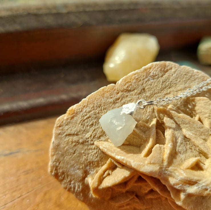This gorgeous raw moonstone has been capped in sterling silver and hangs from a 16-18 inch adjustable sterling silver belcher chain (there is an option to choose 18-20 on checkout). The simple beauty of the crystal is maximised in this format. Each is individual and are approximately 1.5 - 2cm in length.