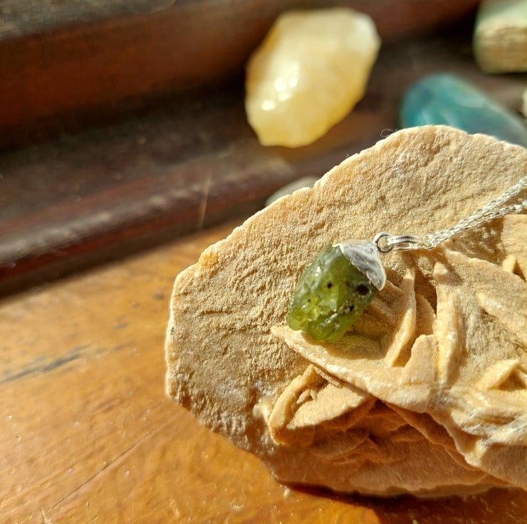 This gorgeous raw Peridot has been capped in sterling silver and hangs from a 16-18 inch adjustable sterling silver belcher chain (there is an option to choose 18-20 on checkout). The simple beauty of the crystal is maximised in this format. Each is individual and are approximately 1.5 - 2cm in length.