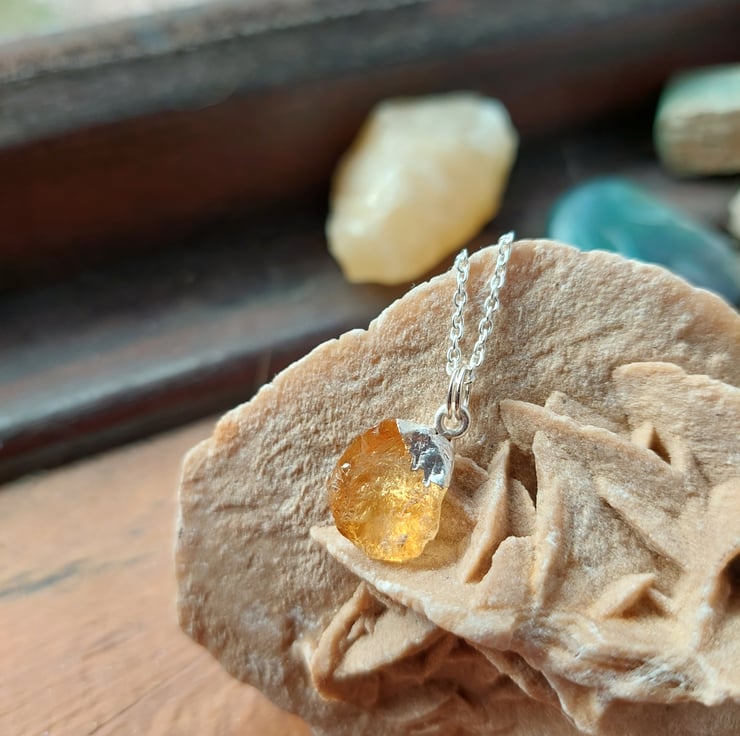 This gorgeous raw Citrine has been capped in sterling silver, looking like a drop of sunshine and hangs from a 16-18 inch adjustable sterling silver belcher chain (there is an option to choose 18-20 on checkout). The simple beauty of the crystal is maximised in this format. Each is individual and are approximately 1.5 - 2cm in length.