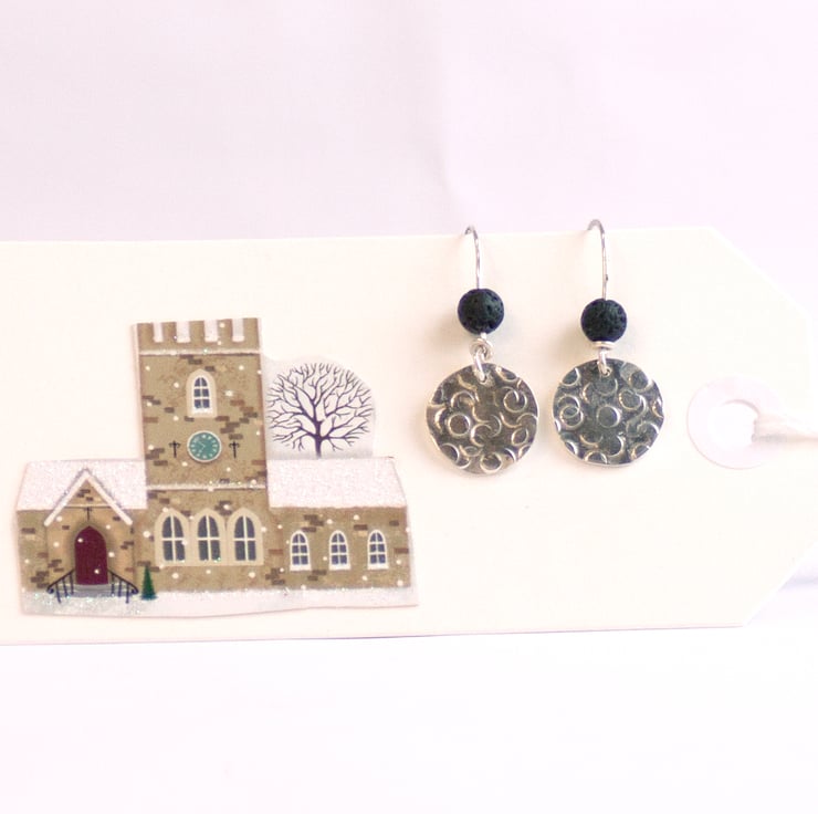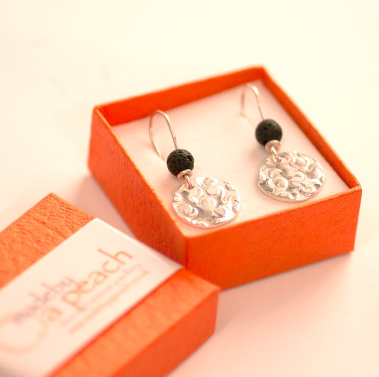 These unique and elegant earrings are handcrafted from recycled sterling silver, paired with a striking black Lava stone bead. The beads were sourced during an unforgettable trip to Iceland, inspired by its natural beauty and volcanic landscapes. The hammered silver texture, created with a specialized tool I recently discovered, adds a personal and contemporary touch that I’ve fallen in love with.