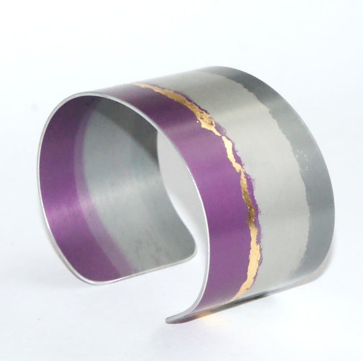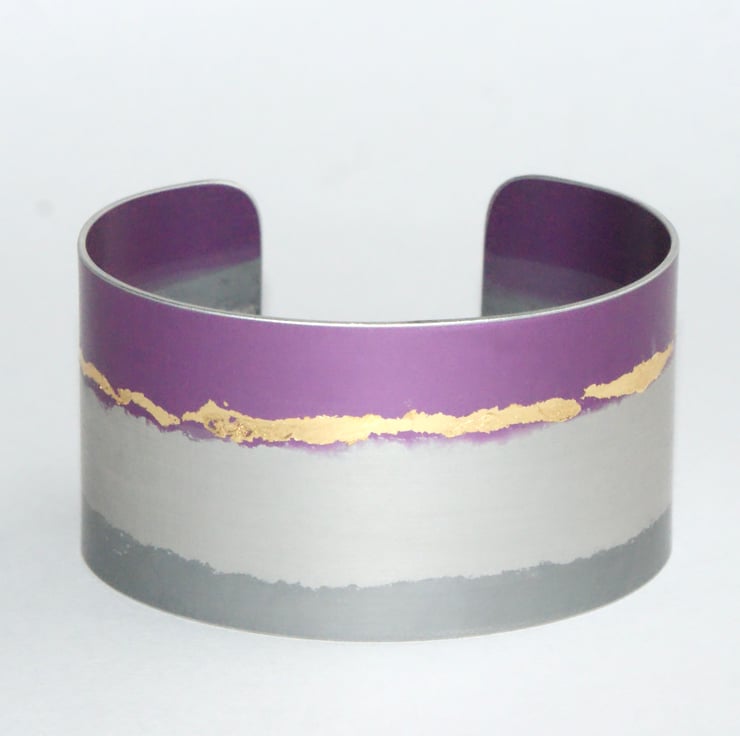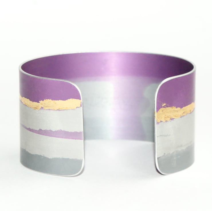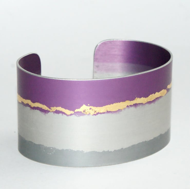 Dress up your outfit with this colourful cuff hand made from anodised aluminium. The material makes the cuff very lightweight to wear and the design is embellished with faux gold leaf for a bit of sparkle. There is a bit of flexibility so the cuff can be slightly adjusted.
