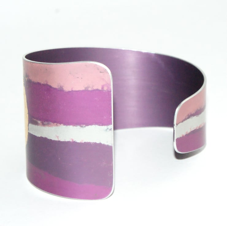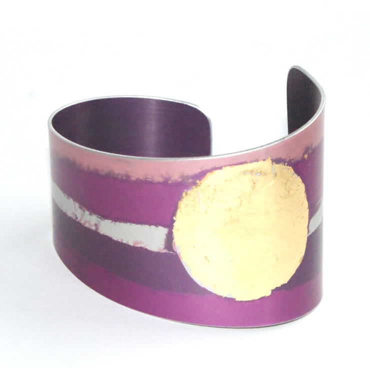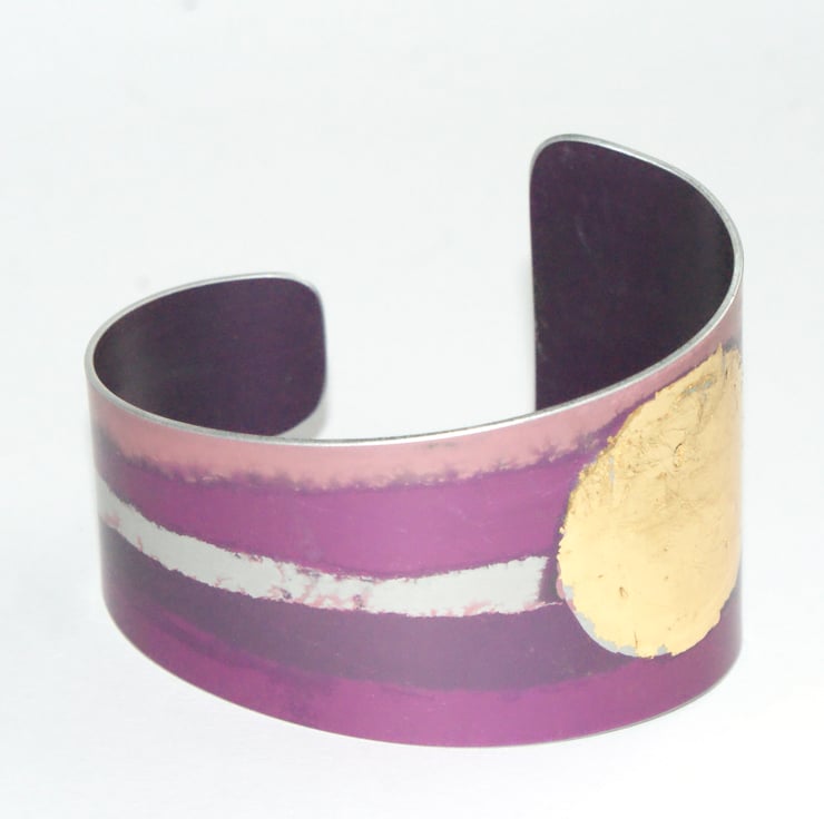 Dress up your outfit with this asymmetric cuff hand made from anodised aluminium. The material makes the cuff very lightweight to wear and the design is embellished with faux gold leaf for a bit of sparkle. There is a bit of flexibility so the cuff can be slightly adjusted.