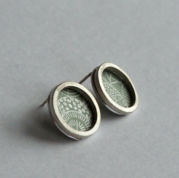 A lovely pair of earrings perfect for everyday wear. The coloured pieces have a forest pattern designed by me and made into a resist which I then apply to the anodised aluminium. The metal is then dyed and sealed and the resist removed leaving the pattern in the silver colour of the aluminium.