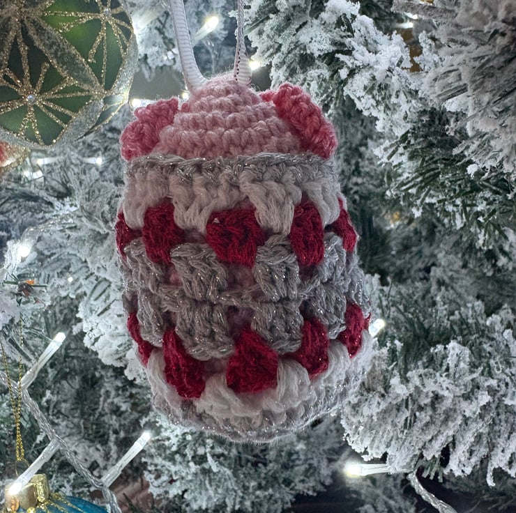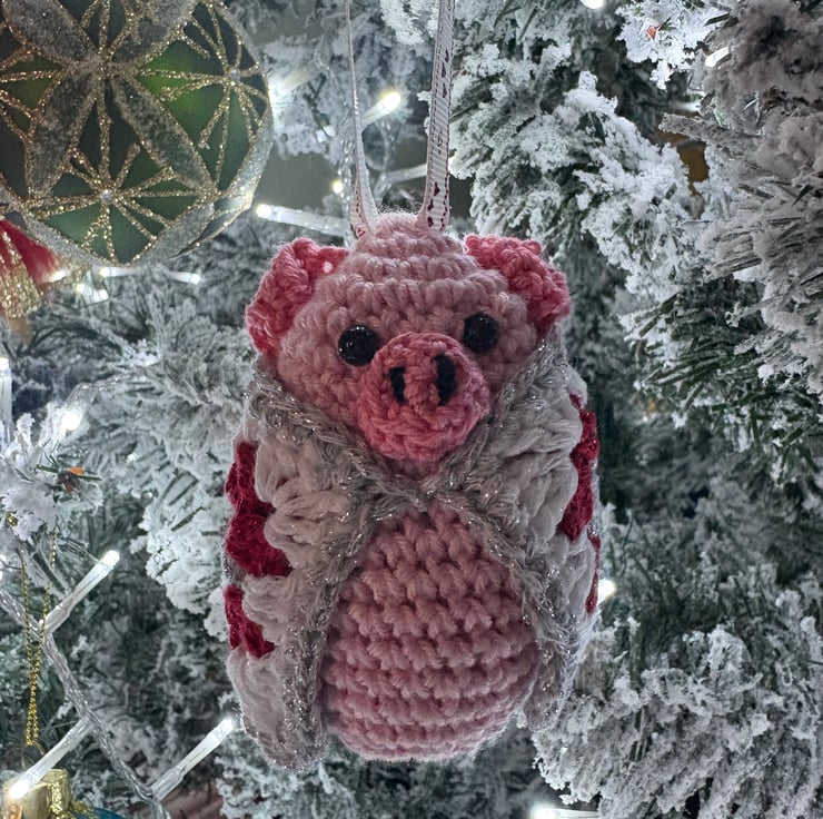This charming crocheted pig ornament is the perfect addition to your Christmas tree.