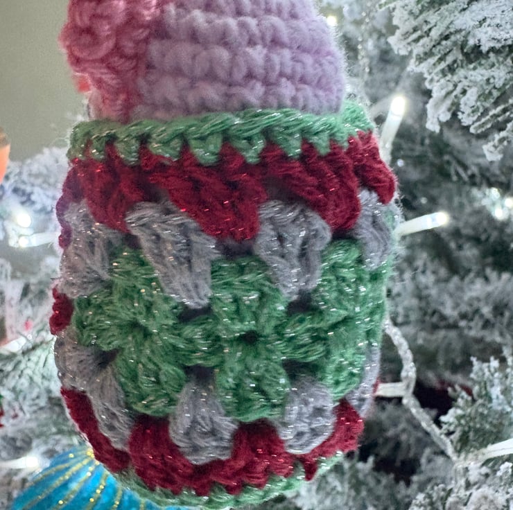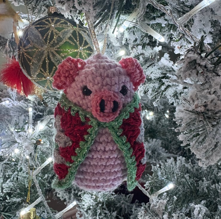 This charming crocheted pig ornament is the perfect addition to your Christmas tree.