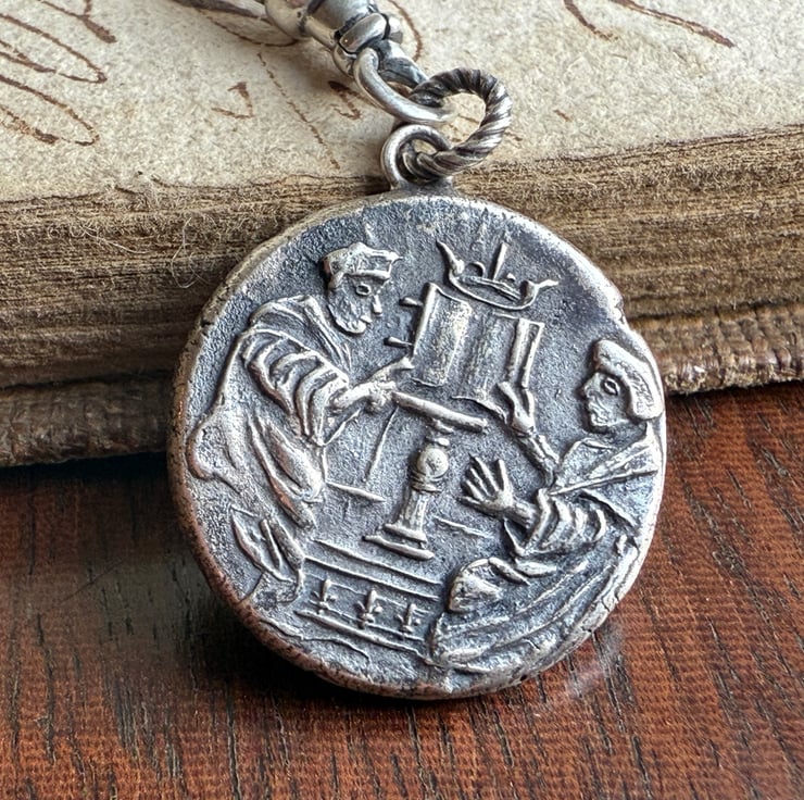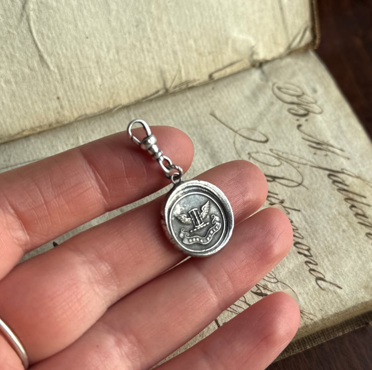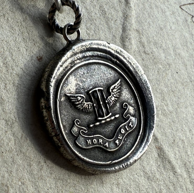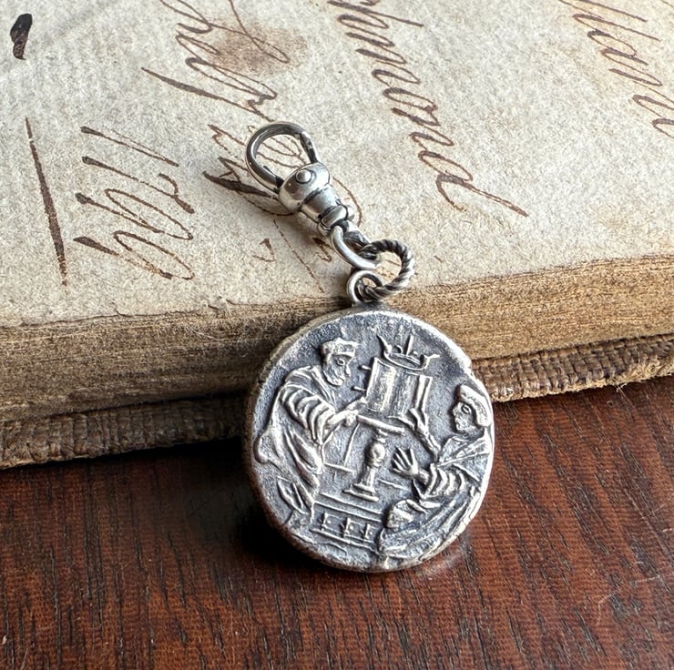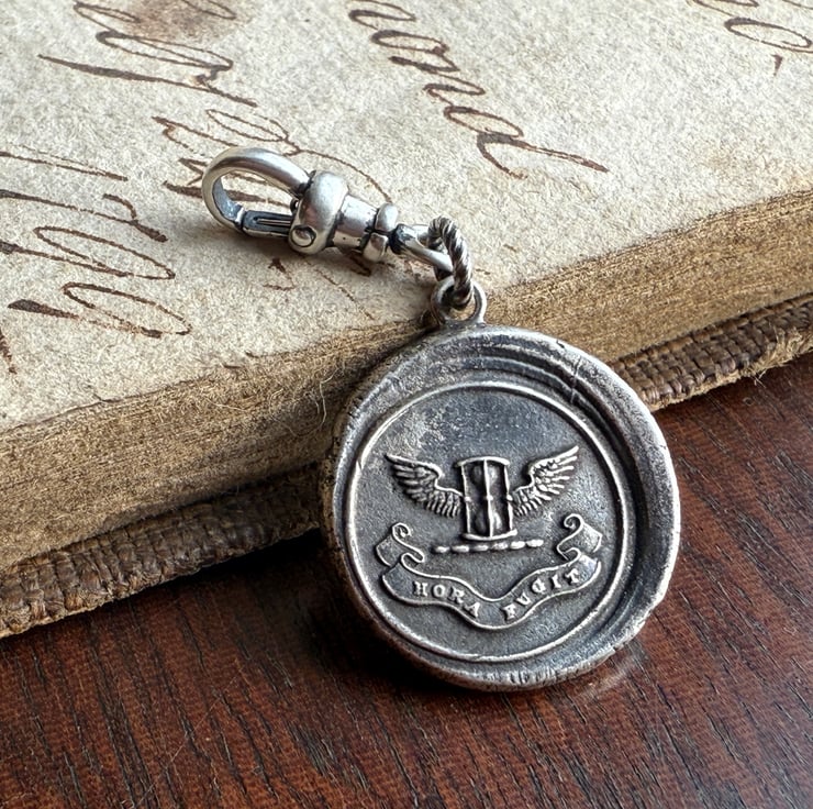 A unique double-sided wax seal clip-on charm. Made with the impressions of an original 17th century document seal featuring two figures and a book and the impression of an 19th century seal with the latin motto "HORA FUGIT" (the hour flies) with a winged hourglass motif on the reverse.