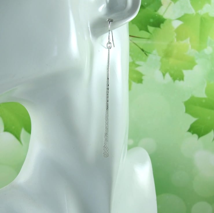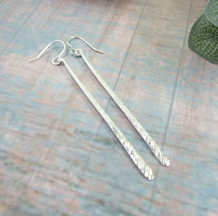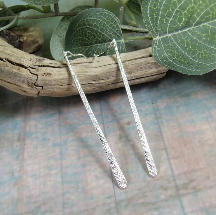I have created the long teardrop shapes from recycled silver wire, forged into a long bar shape then then textured with a hammer to create the crosshatch pattern. Fitted to sterling silver ear wires.
