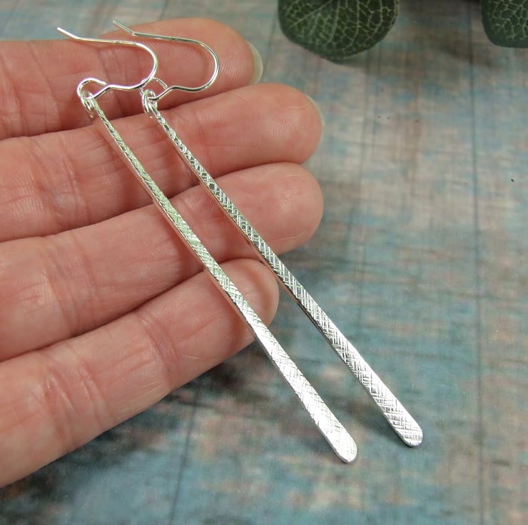 Sterling Silver Extra Long Teardrop Bar Earrings. Hammered crosshatch texture with sterling silver ear hooks. Earring bar measures 2.5 inches.