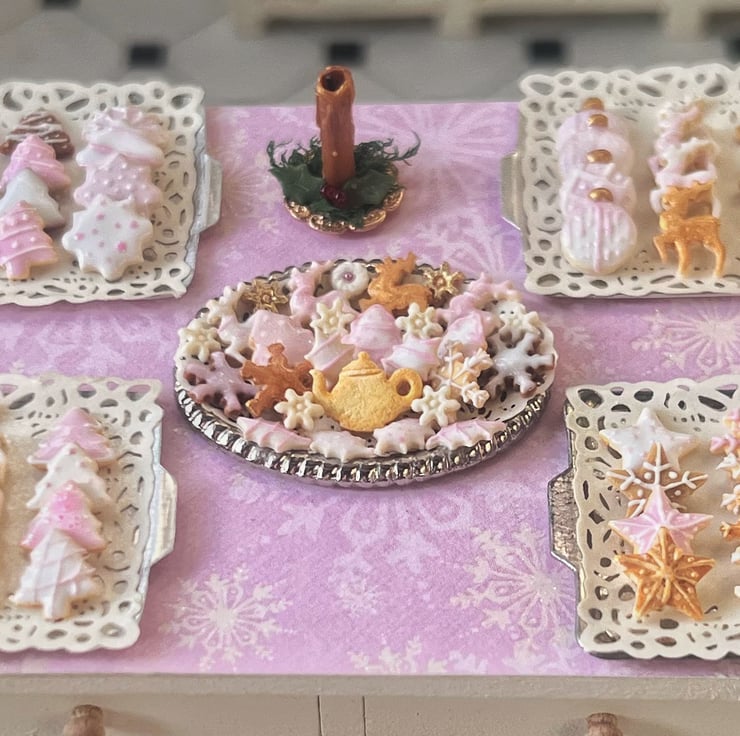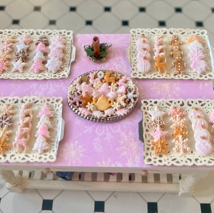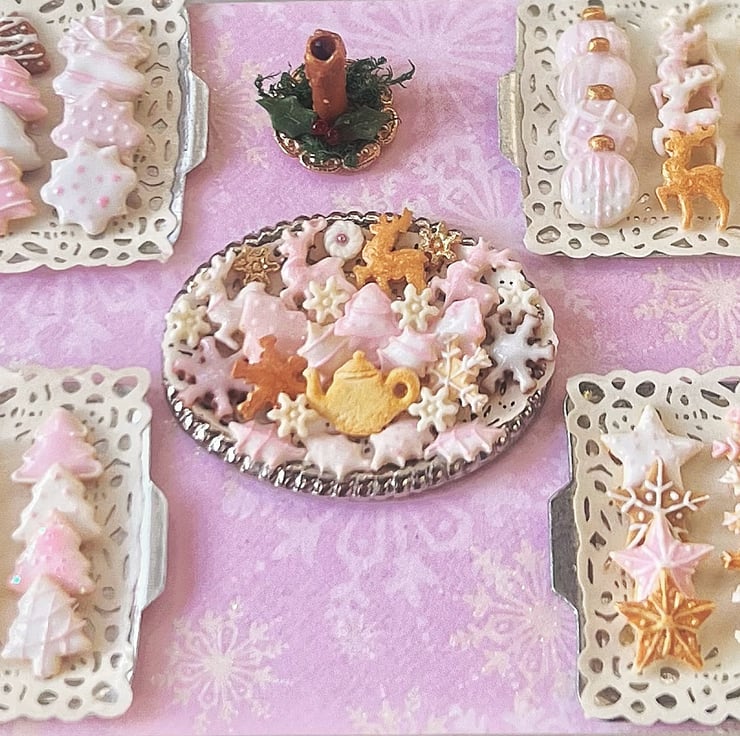 A tray of iced Christmas themed biscuits and white chocolate in dainty pinks, white and gold.