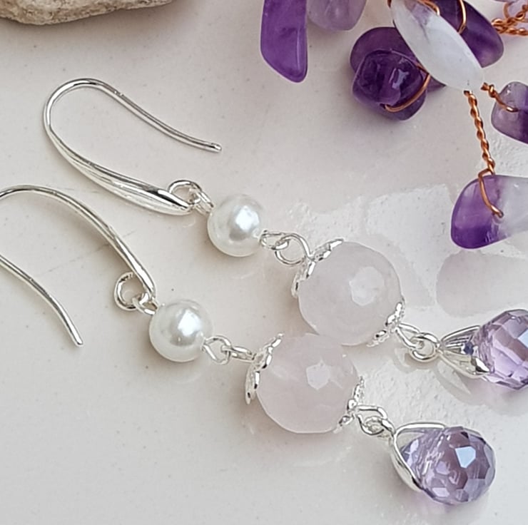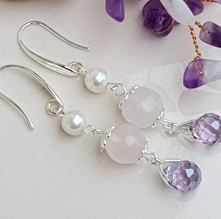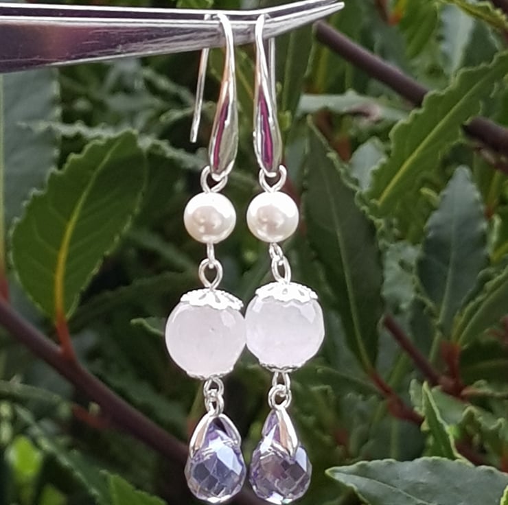 The earrings are decorated with pale rose quartz beads 10 mm in diameter, pearl beads and small Austrian crystal beads .