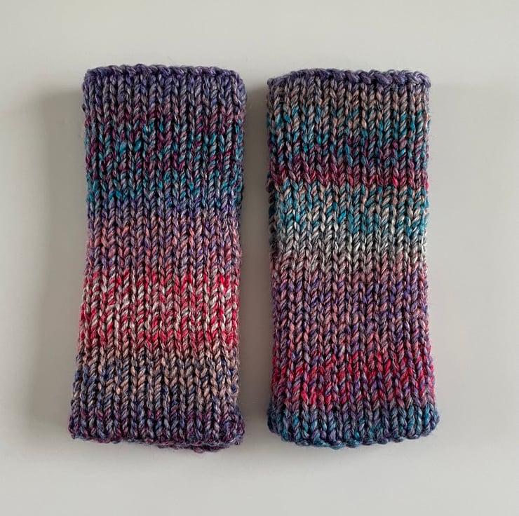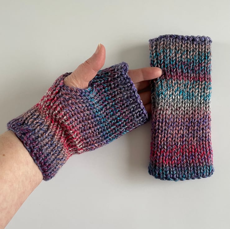 These fingerless gloves are double layered, so they will keep your hands warm and cosy. When you need to use your hands, simply place your thumb inside, pull them further down your arm and wear them as wrist warmers.