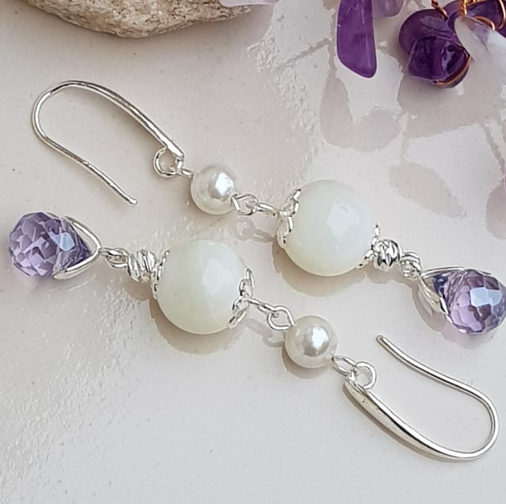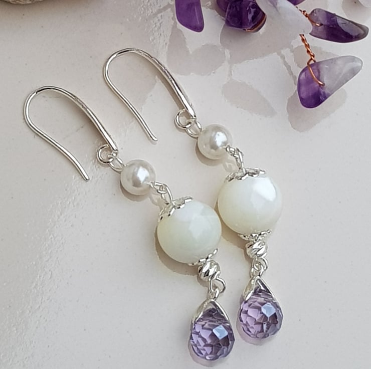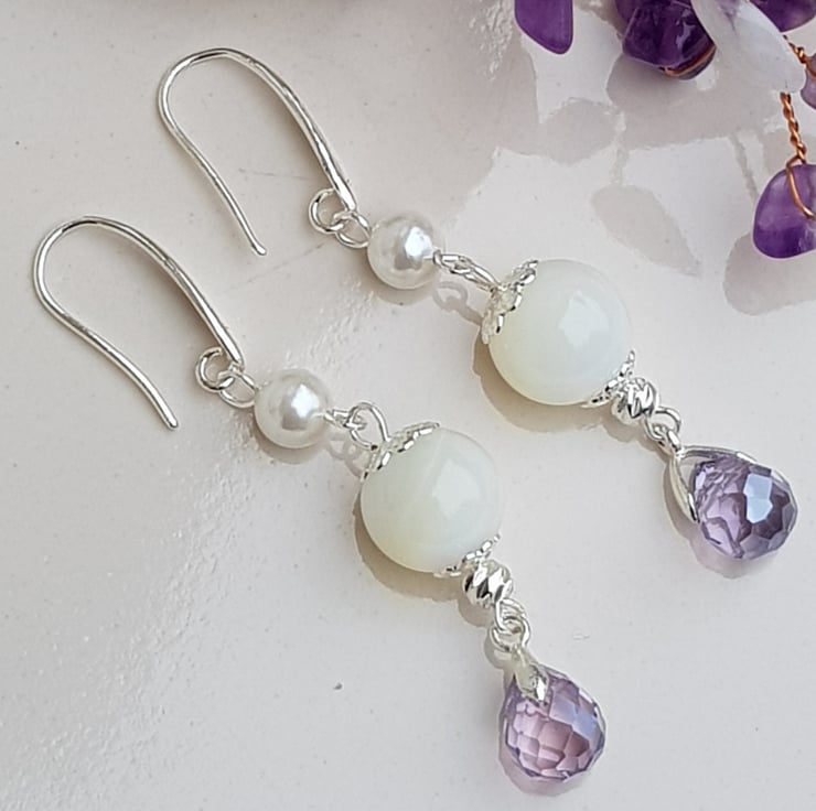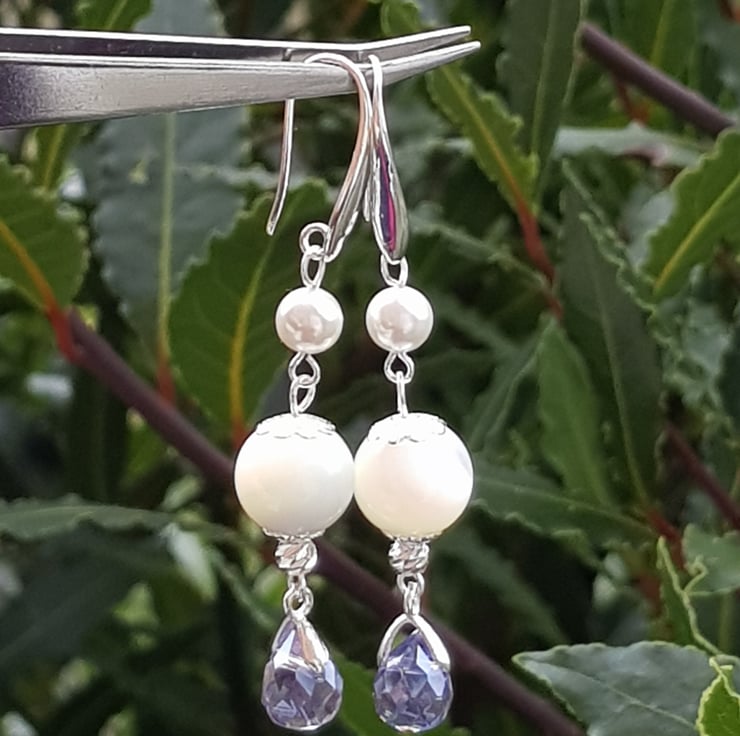 The earrings are decorated with white mother of pearl beads 10 mm in diameter, pearl beads and small Austrian crystal beads .