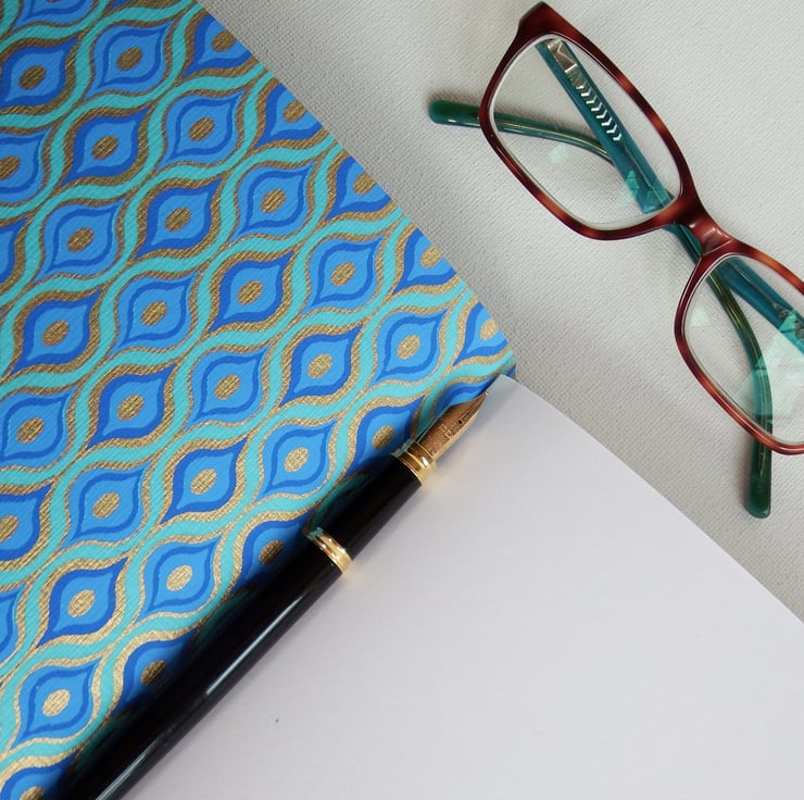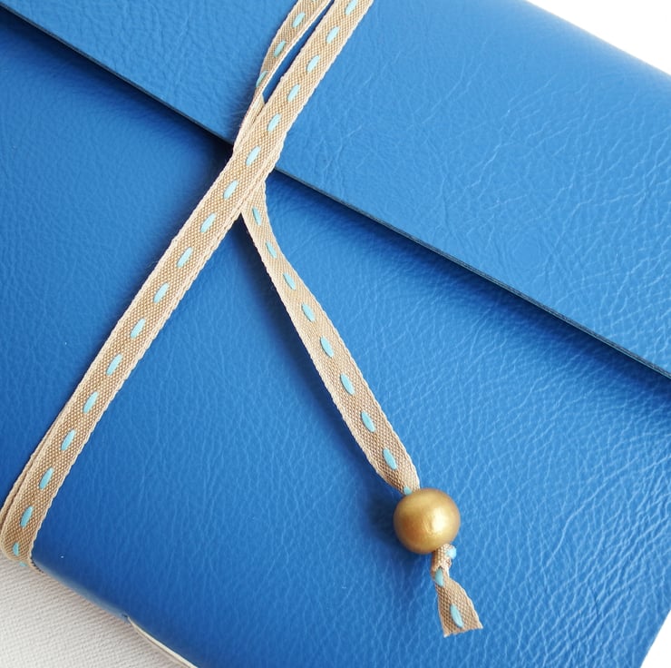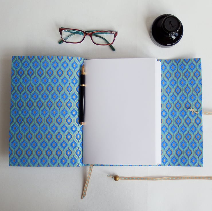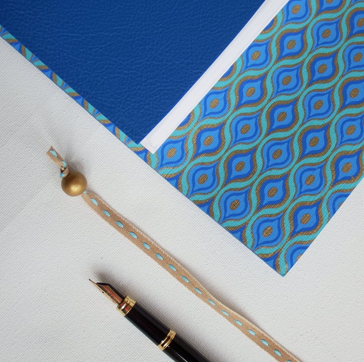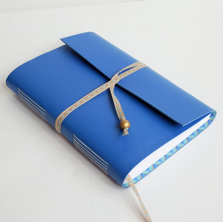 Beautiful Bright Blue Italian Leather Journal, Hand Bound and lined with a stunning Indian Cotton Paper in Blue and Gold. Can be used as a Sketchbook, Journal, Art Journal or Bujo.